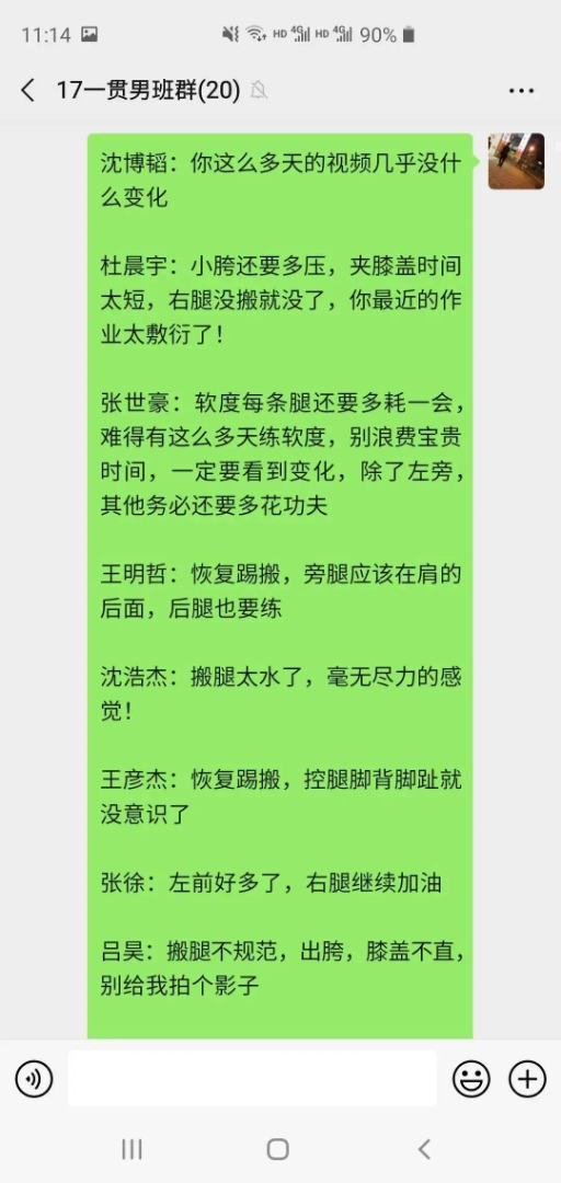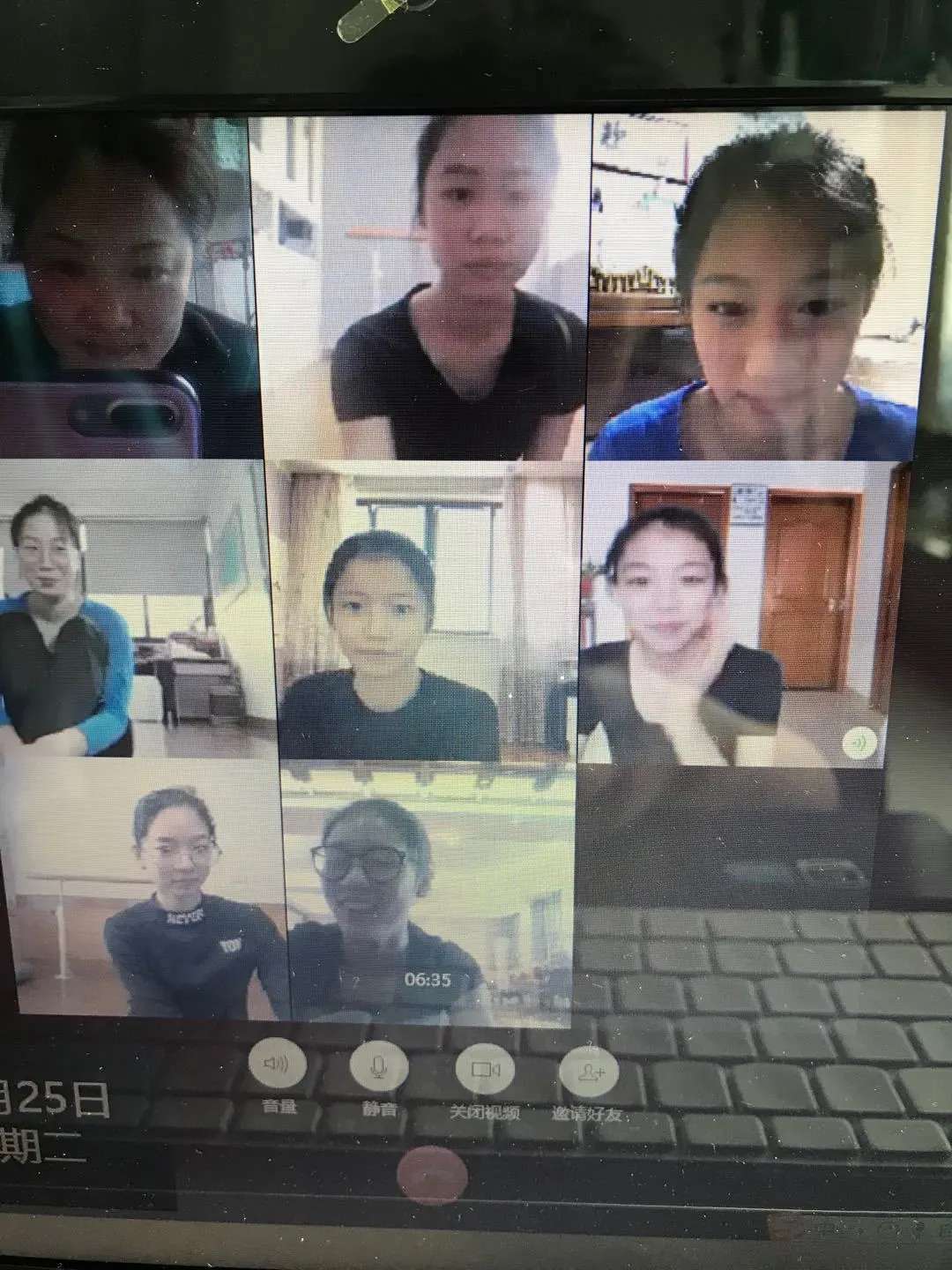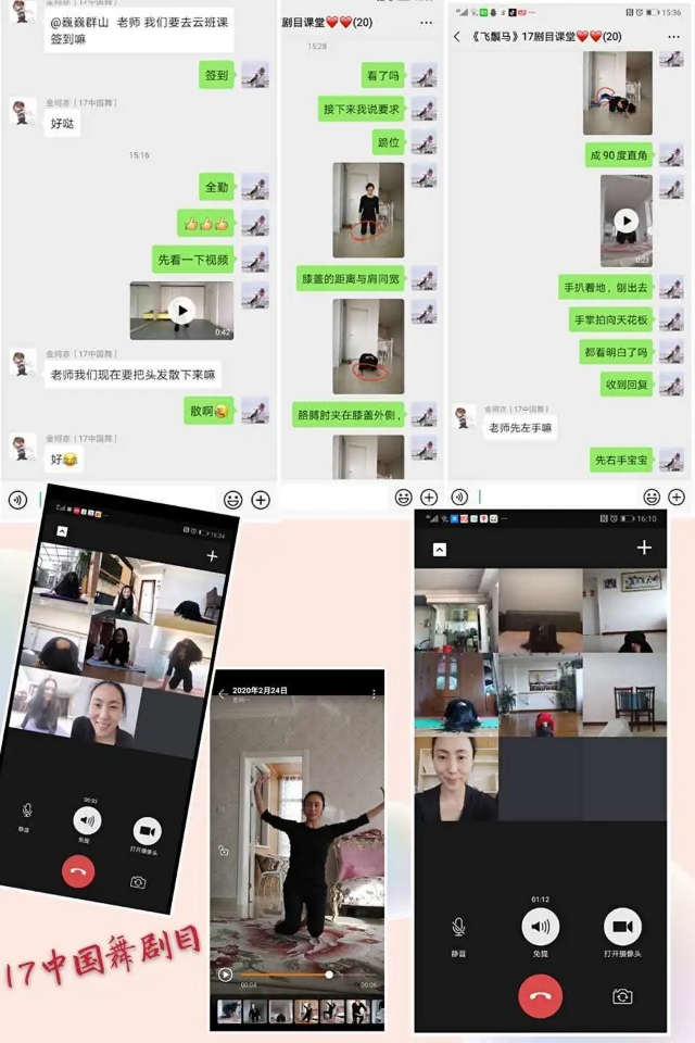 一天下来,舞蹈系教师微信群里,都是老师们上传的网络授课截图、录屏,老师们认为,网络授课要比日常授课更加辛苦,关注点的分散让老师的神经更加紧绷,反应也需要提速不少;由于手机、电脑屏幕因人数众多而需要多屏显示,有的动作,老师的眼睛都是贴着屏幕进行,有时为了让因拍摄全身站位而远离手机的学生听见老师的要求,有的老师基本全程“吼”了一节课;授课过程中,网络卡顿时有发生,老师们一个动作往往要讲解多遍,示范多次,即便如此,所有老师依旧全身心投入与付出,严谨而规范。部分同学在课后感想中表示,网络授课比起日常教学来说更加紧张,当看见老师的眼睛无时无刻、“直勾勾”的盯着自己,根本不敢分心、偷懒,相对老师的教学动作也更加的关注和仔细;同时同学们也表示,网络授课最重要的还是线下的练习、作业的完成和难点解决。