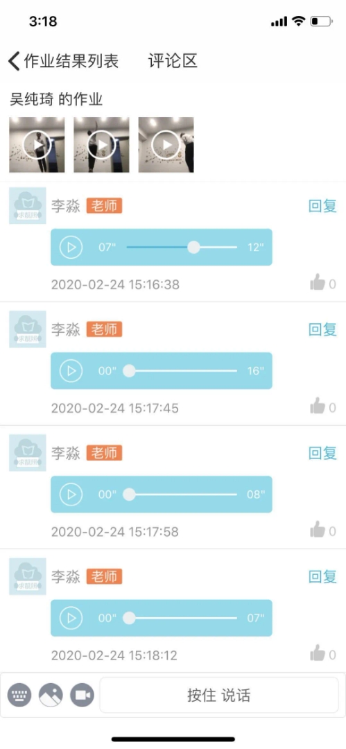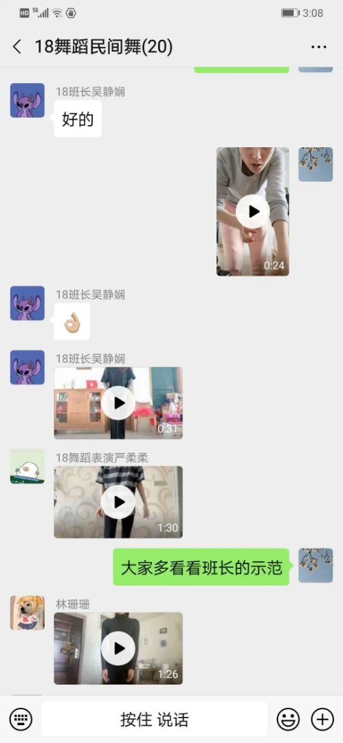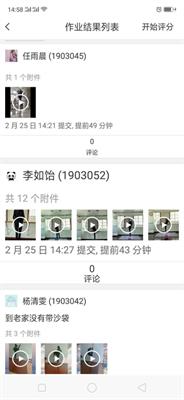 以上专业课与软度与毯技、乐理等课程还运用了蓝墨云班课、钉钉、微信等在线教学和交流平台,进行了课后作业的布置,其中除了复习网络授课内容外,还增加了身体基础素质训练、易错动作重复练习视频拍摄、音乐剪辑软件使用与成品制作、理论教学心得自述等内容。所有的课后作业布置有具体的内容限定,包括时间长短、完成数量、不同角度的图片拍摄,教师也通过以上平台,分别对作业进行打分、文字和语音点评。