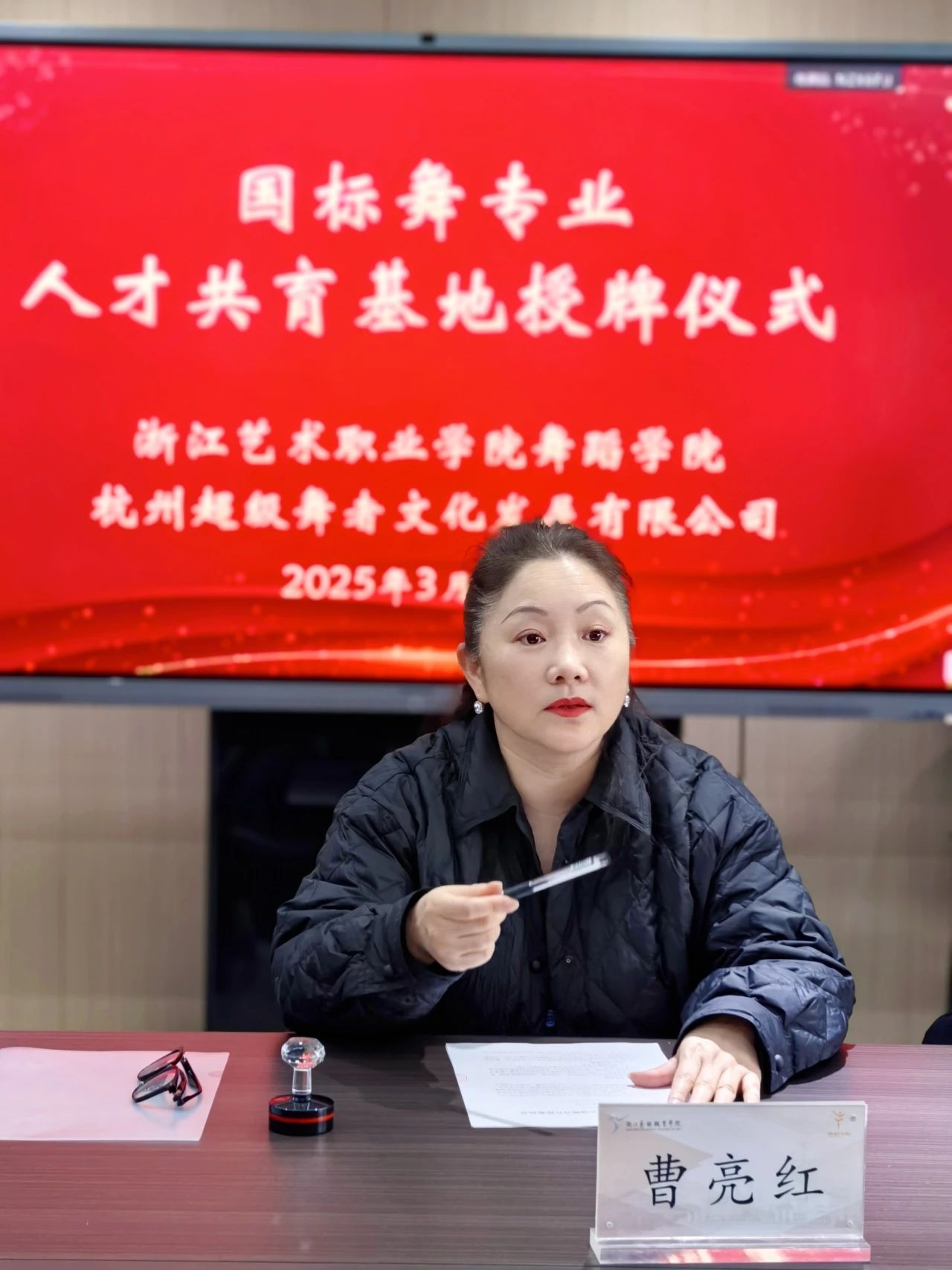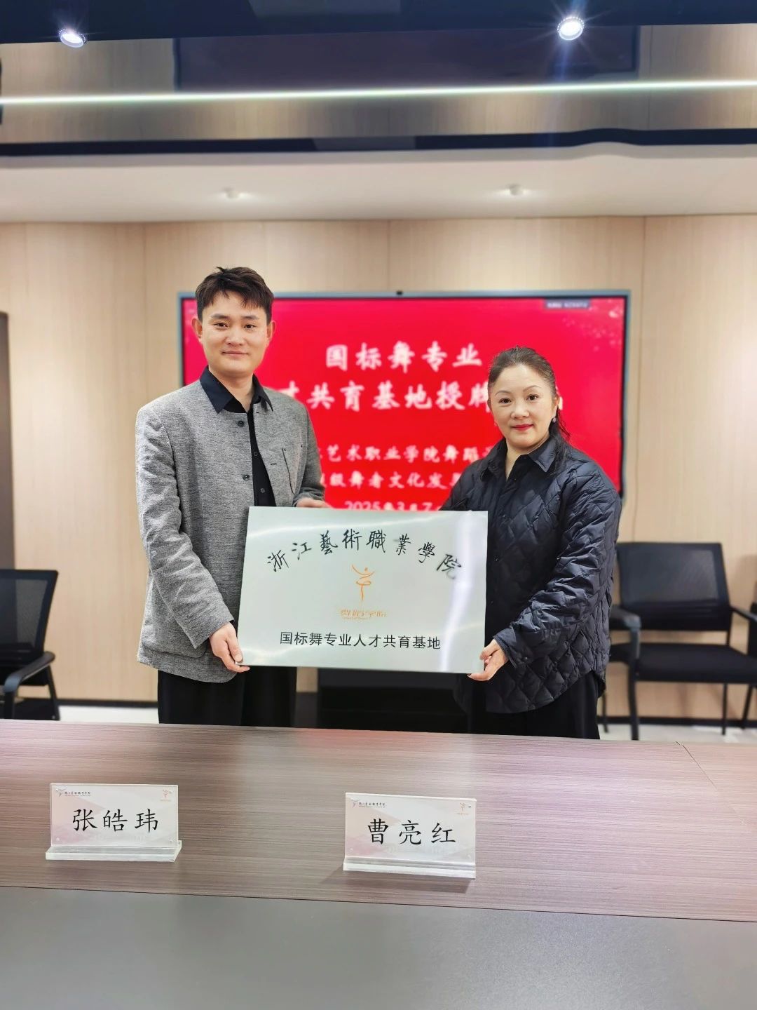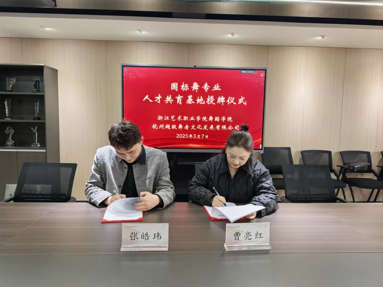 3月7日,舞蹈学院与杭州超级舞者文化发展有限公司(以下简称超级舞者)合作共建“国际标准舞专业人才共育基地”签约授牌仪式成功举行,标志着国标舞人才培养战略合作迈入实质性阶段。舞蹈学院院长曹亮红、党总支书记郑吟、副院长包峥剡,超级舞者负责人张皓玮及相关代表出席活动。