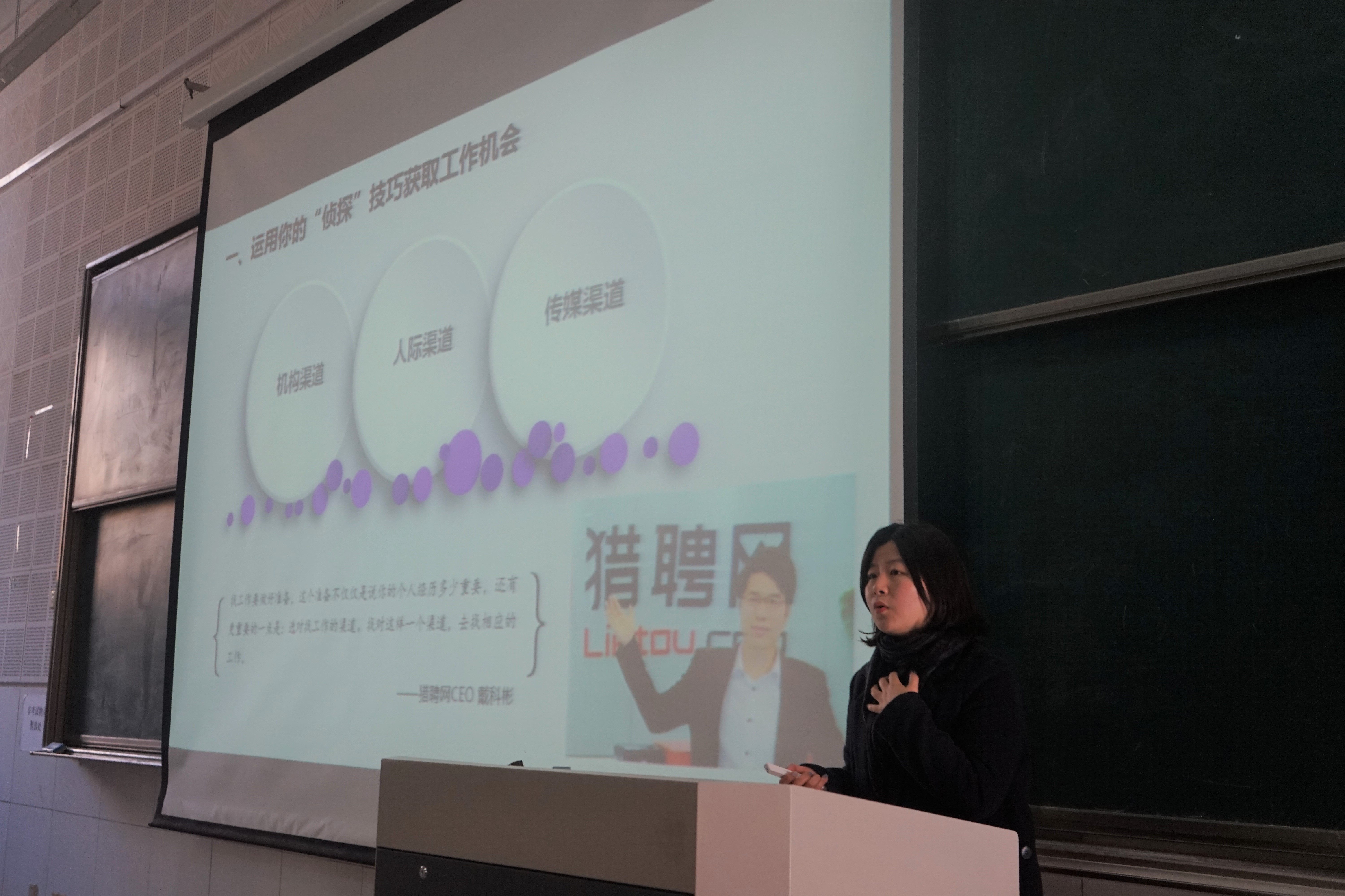 潘帆以一份视频简历开头,向学生传授求职技巧。潘帆告诉学生们:要用“侦探”技巧获取工作机会,即通过机构、人际和传媒的渠道发现工作机会,并通过了解上届毕业生就业情况、走访亲戚朋友等职业人士、了解本院校重点单位库等具体做法抓住机会。