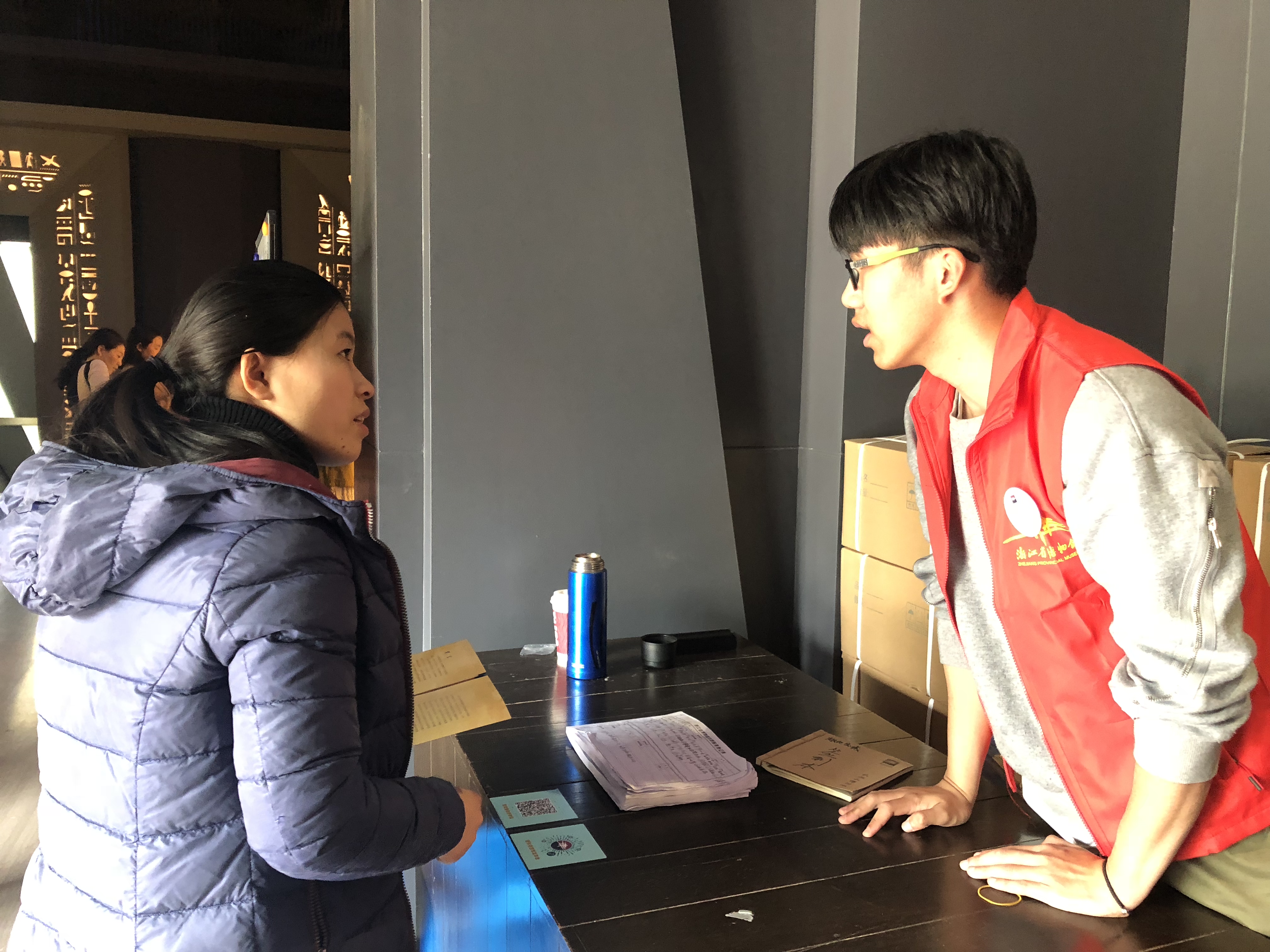 文化管理系的学生志愿者们则有的在图书馆内协助管理人员进行图书分类、上架摆放,协助小读者们养成良好的阅读习惯;有的在西湖美术馆的古埃及文明展向参观者们分发展览小册子、讲解关于古埃及文明的历史、象形文字、木乃伊等,使参观者更好的领略“法老的国度”;有的在名人纪念馆第二课堂给小朋友们介绍和示范如何拓印;有的在献血站为大家普及献血知识,为献血者们做好服务;有的在低碳科技馆内向游客进行低碳知识及展品的讲解,对展品进行操作演练或针对展品为观众提供咨询答疑服务等等。值得一提的是,我系18级民族传统技艺班的牟紫薇和余佳盈同学在古埃及文明展志愿服务时,还救助了一位晕倒的参观者,将其扶到志愿者休息室并加以安抚缓解,事后患者朋友专程赶回博物馆,表达了对志愿者由衷的谢意,浙江省博物馆还就此事进行了报道。