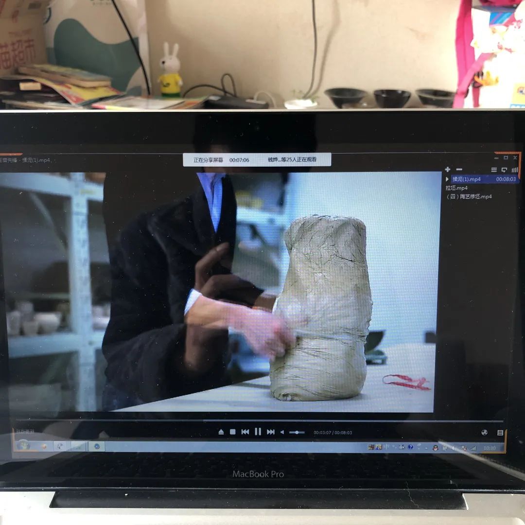 民族传统技艺专业核心课程有青瓷烧造技艺、石雕技艺、水印木刻技艺、汉代器艺、传统印染等。因课程大多需要操作实践,教研室老师们就采用理论联系实践,PPT教学与线下操作直播同步进行的方式进行线上教学,让学生能融会贯通,一目了然。青瓷烧制技艺课程教师通过PPT讲解陶瓷基础——材料及成型方式,通过视频演示器皿制作及烧成(弦纹炉的制作及烧成)让学生更直观地了解青瓷烧制的整个过程。