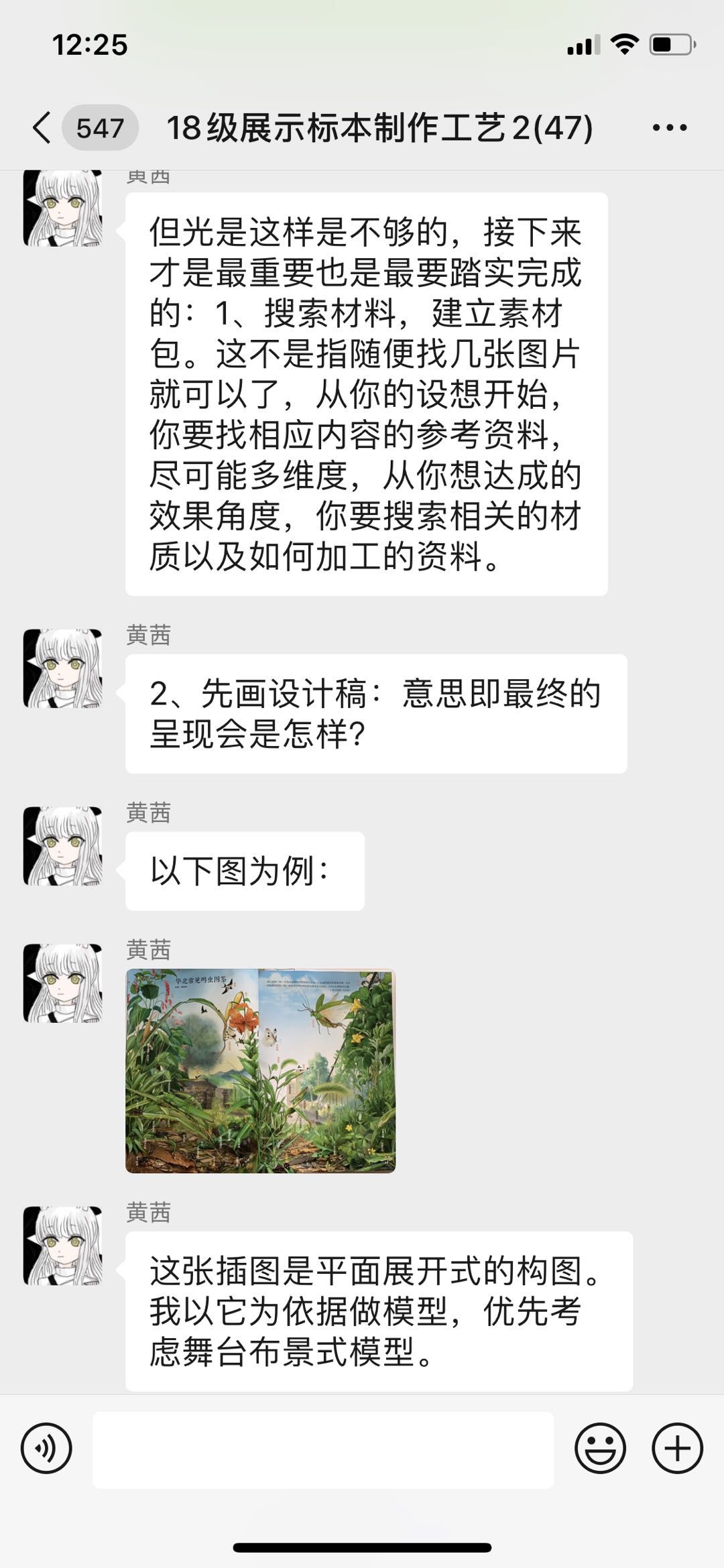 展示艺术设计专业核心课程有博物馆展示设计、平面设计基础与应用、展览展示制作、展示标本制作工艺、博物馆场景制作等。任课教师们采用微信平台线上分组教学,点对点施教,开发学生创作思路,激发学生创作灵感。展示标本制作工艺2课程通过教师提供图片资料给学生拓宽思路,区分现实与虚拟场景,学生自由选择主题举例,教师逐个线上点评,课后布置作业完成首次课程。
