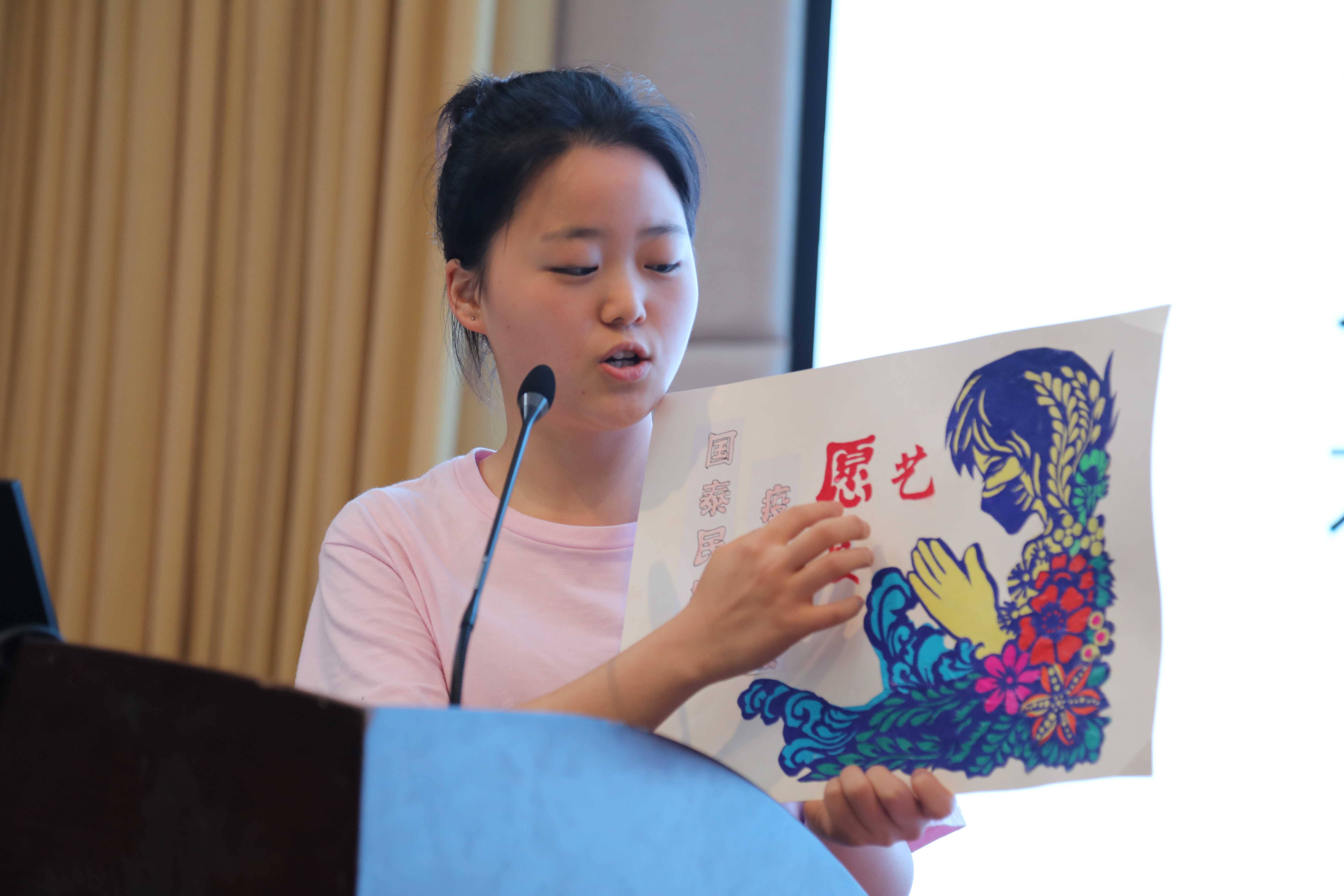 18公共文化班项程金的彩色剪纸《愿》,表达了大家一起默默守护心中的愿。她说希望疫情能够尽快消散,祝愿我们的国家能够国泰民安。