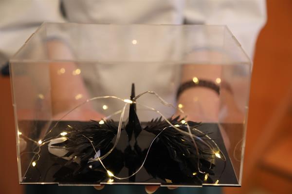 你有见过黑色的千纸鹤吗,18公共文化何懿欣就带来一个由立体拼接模型制作而成的黑色千纸鹤《从暗来向光生》。千纸鹤代表美好的祝愿同时也代表传递的希望,黑色千纸鹤是送给今年暖春里每一位和病毒抗争的勇士,祝愿黑暗终会消散,光明就在前方。