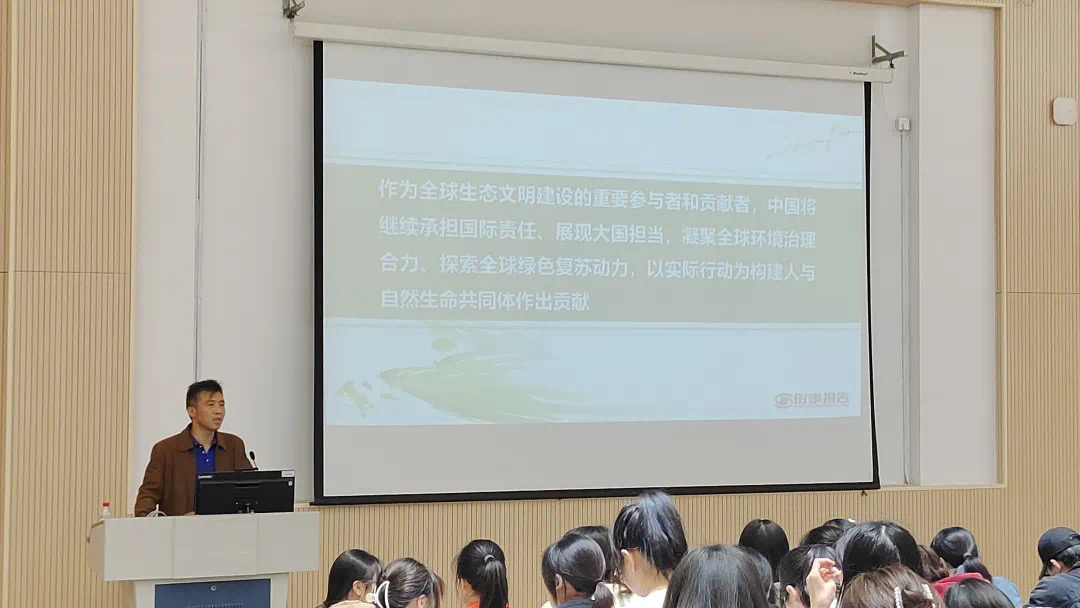 课上,沈军甫围绕“现实之困”、“中国方案”、“中国担当”三方面向同学们展现着了共同构建人类与自然命运共同体的重要性。他通过对自然因素与社会因素的结合举例,阐述了现实之困给人类带来的危害,以”一荣俱荣,一损俱损”的立场更深层的表示出当下环境问题的严峻性以及国际社会团结合作的意义。沈军甫分析了习近平总书记的生态文明观,展现生态兴,文明兴;人不负青山,青山必不负人的思想主张。他说道:“生态是统一的自然系统,不能因小失大,急功近利。”让在座学生们受益匪浅。