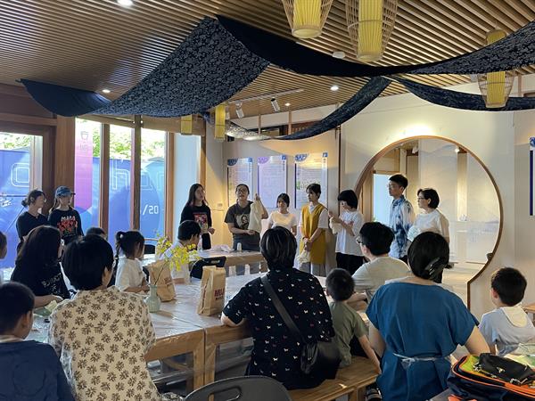 民族传统技艺专业教研室主任傅菲菲介绍了扎染场景的布局设计与展览新意,希望置身于展览中的家长们能更好地体验扎染文化氛围,了解扎染工艺,发挥想象力,创造出各具特色的扎染作品。