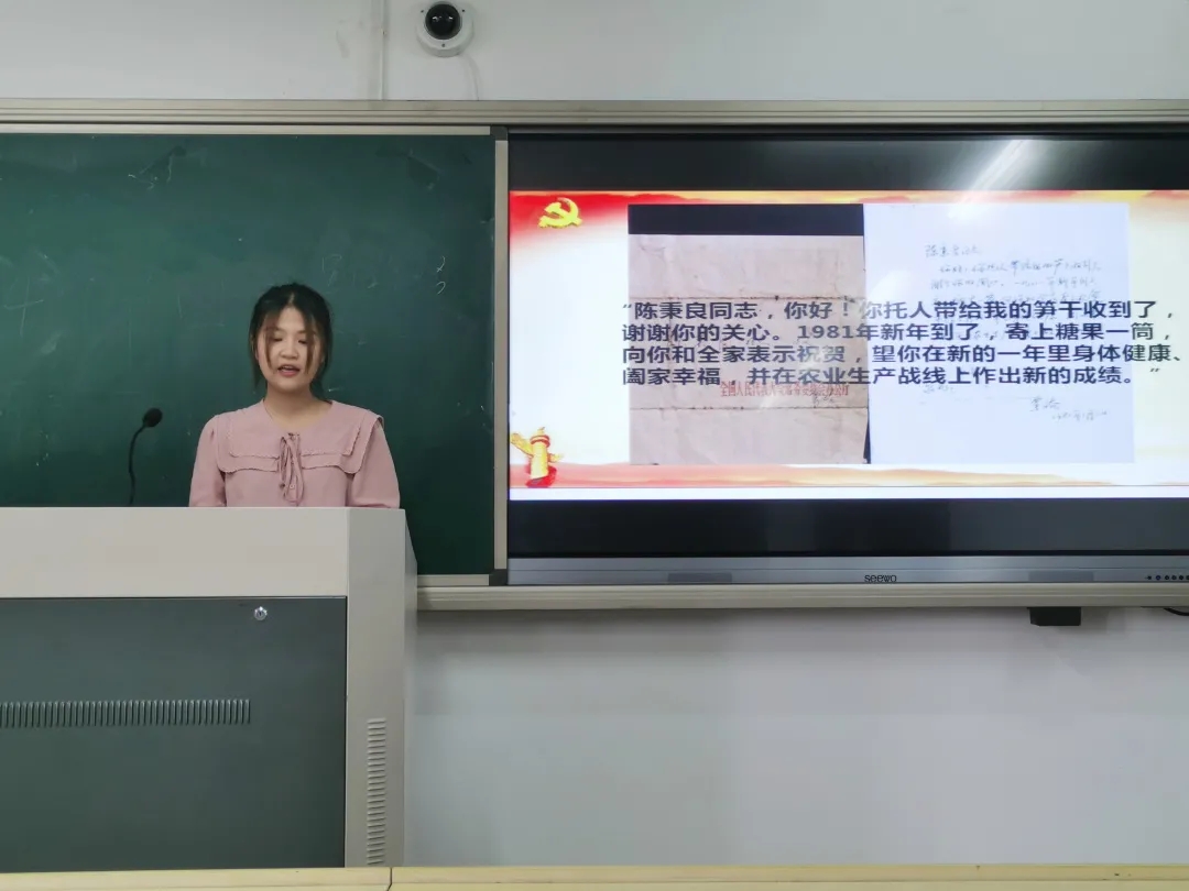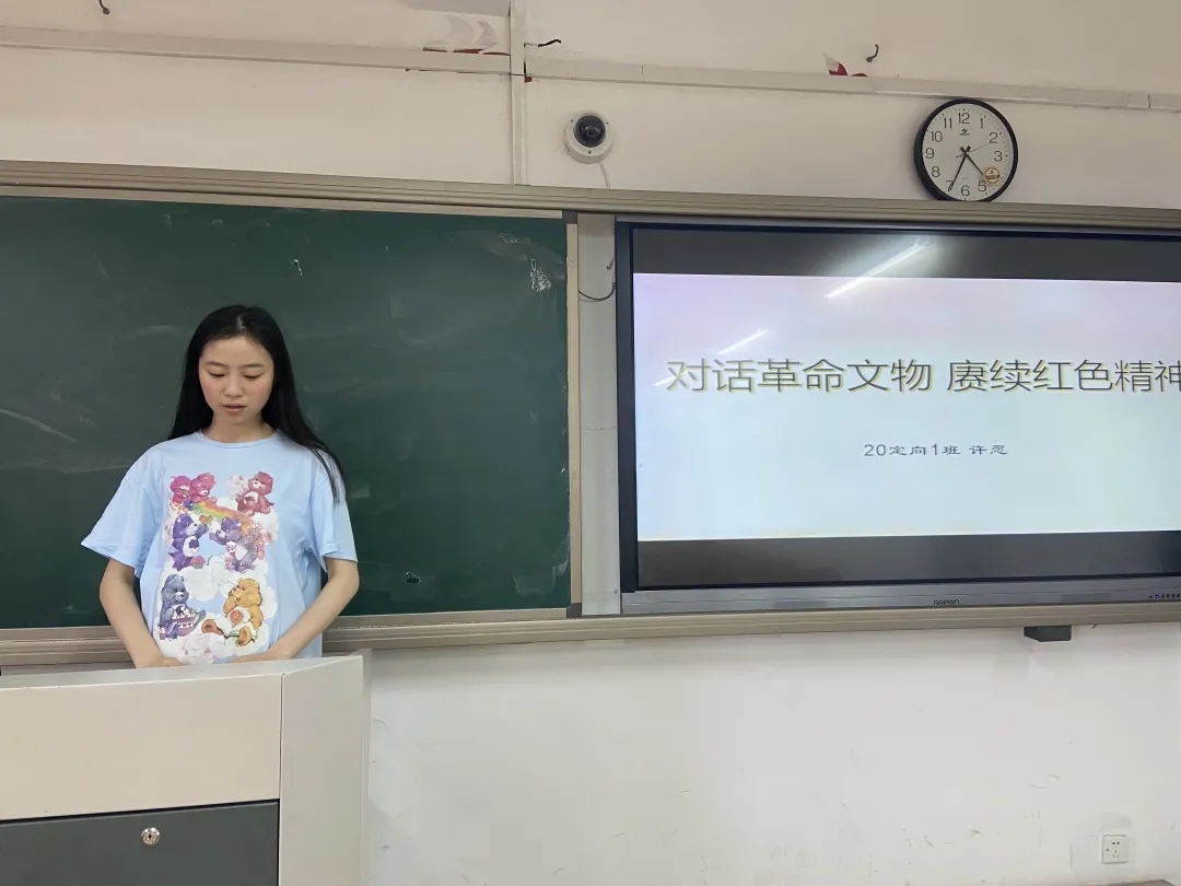 20定向1班许愿以“对话历史文物 赓续红色精神”为主题,带领大家走进安吉姚家大院,向我们重现了粟裕等一代革命先辈们在这里艰苦奋战、履创战果的三次反顽战役。她结合自身实际情况,谈到作为一名未来的乡镇文化员,应将红色文化孕育在五彩斑斓的群众文化活动之中,做一名出色的传播者,让红色文化在乡村振兴中提供源源不断的动力。