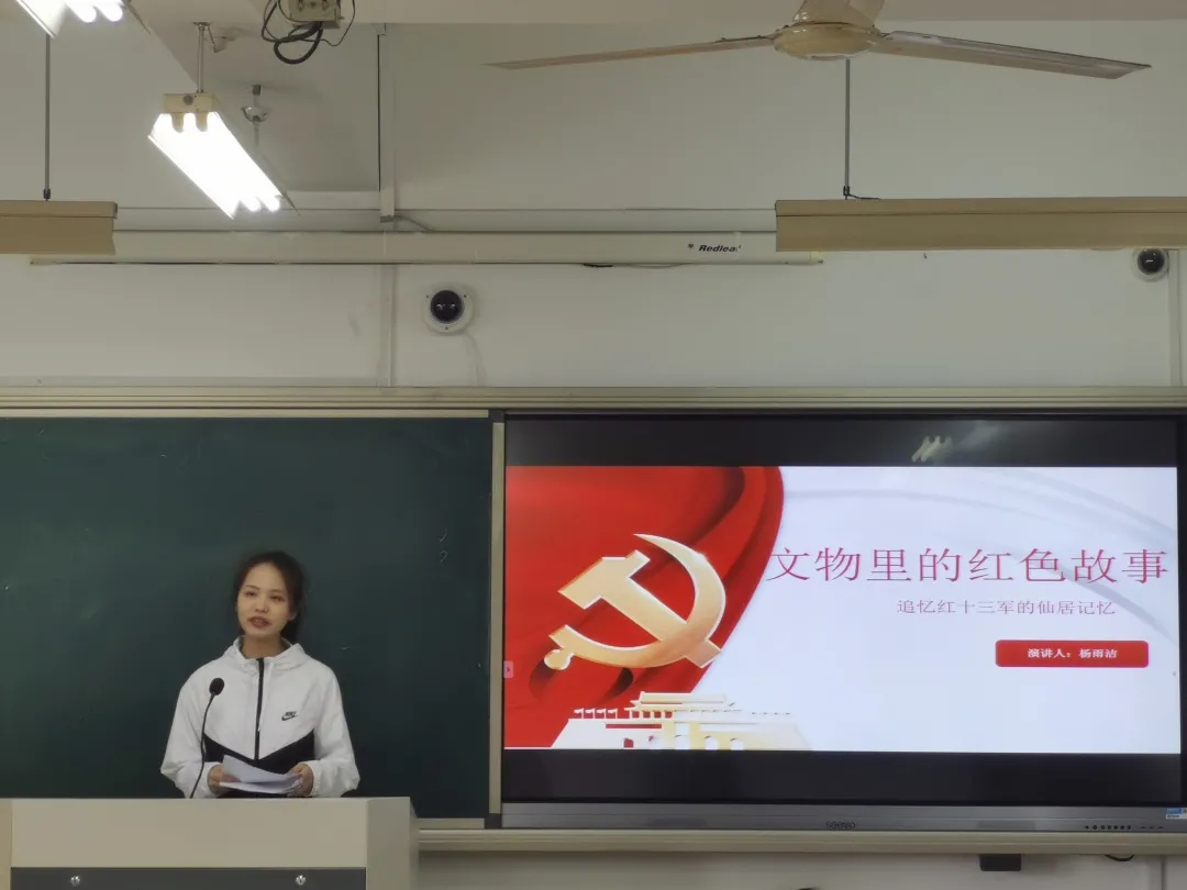 20定向1班杨雨洁通过“追忆红十三军的仙居印记”为主题,带我们走进故事的主人公“红一团”仙居游击队队长——金永洪。“共产党人是杀不尽的!”他这声在殉难时向敌人的怒吼,再次将“不怕死的神枪队”的革命精神展现在我们面前。她指出,为了在将来成为一名更好的乡镇文化员,应致力于将文物中的红色党史故事,通过各种形式让大众去认识,去了解。