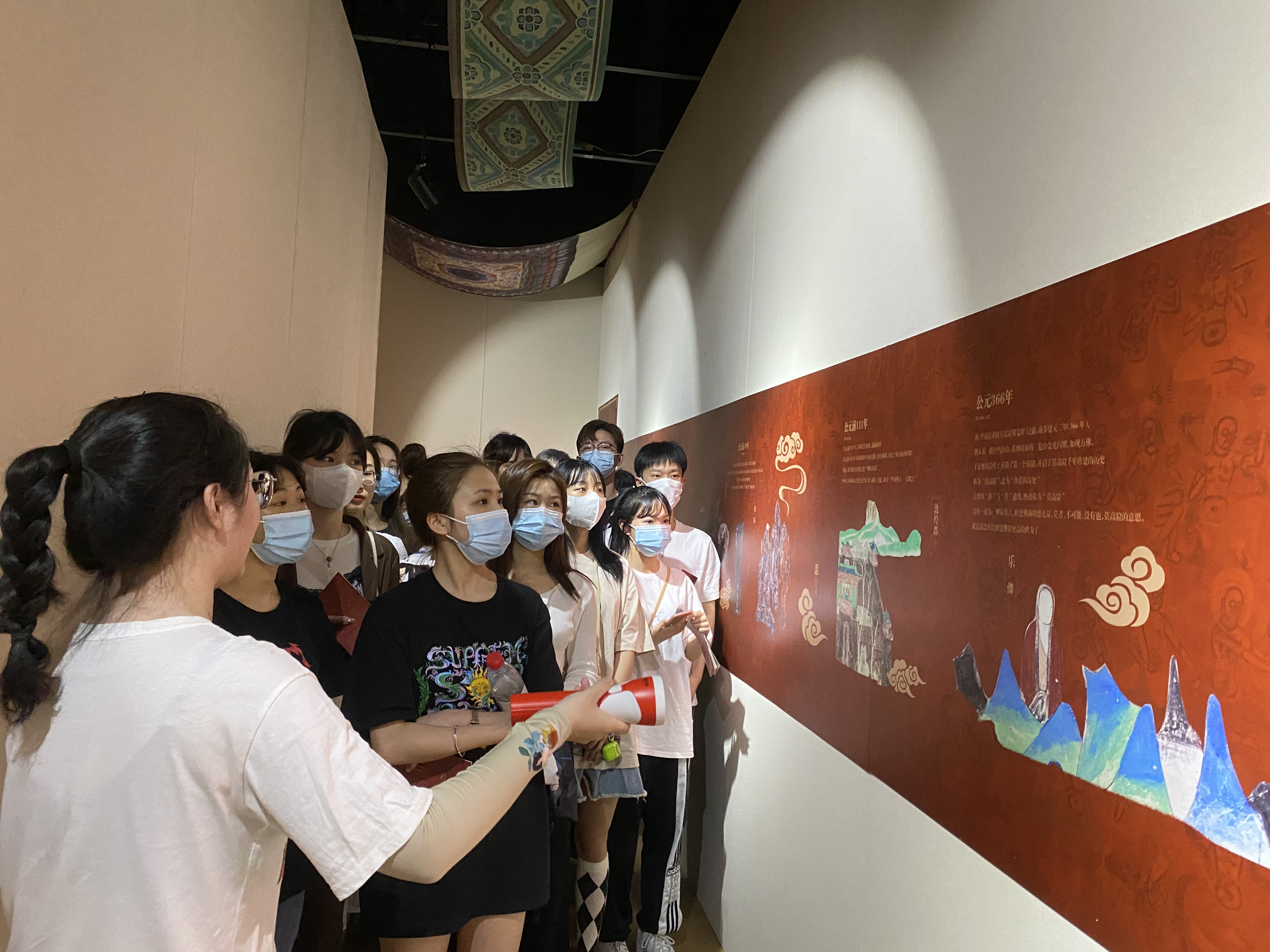 展厅展陈了莫高窟的石窟艺术,分为早期、中期、晚期三个阶段。讲解员带领师生走近敦煌壁画艺术,讲述莫高窟的大事记。敦煌石窟和敦煌藏经洞出土的文物浓缩了中古敦煌的历史,形象地记载了在开放背景下欧亚文明的互动、汉民族与其他民族的交融;反映了4—14世纪一千多年间佛教及艺术的流传及流变;保存了丰富生动的中外艺术形象及艺术的源流传承;展示了中古时期广阔的政治、军事、文化、科技等社会生活的场景,具有超越时空经久不衰的魅力,在不同时代、不同民族、不同信仰、不同地域的人们中间产生共鸣。这也正是中华民族以自己的优秀文化为世界做出的贡献之一。