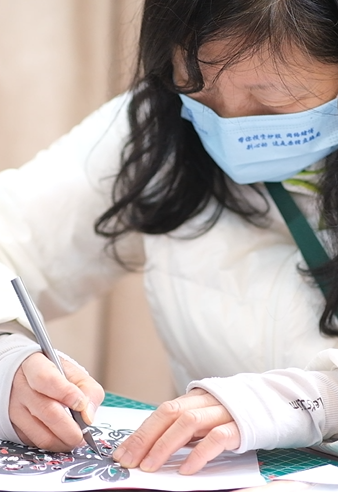 剪纸教学活动伊始,手工艺师生讲解了剪纸工具、制作过程与注意事项。以党的二十大和新年生肖兔为主题模板,学员们聚精会神,耐心把握好刻刀力度,仔细刻画自己的作品,在其中体悟剪纸的艺术魅力和乐趣。