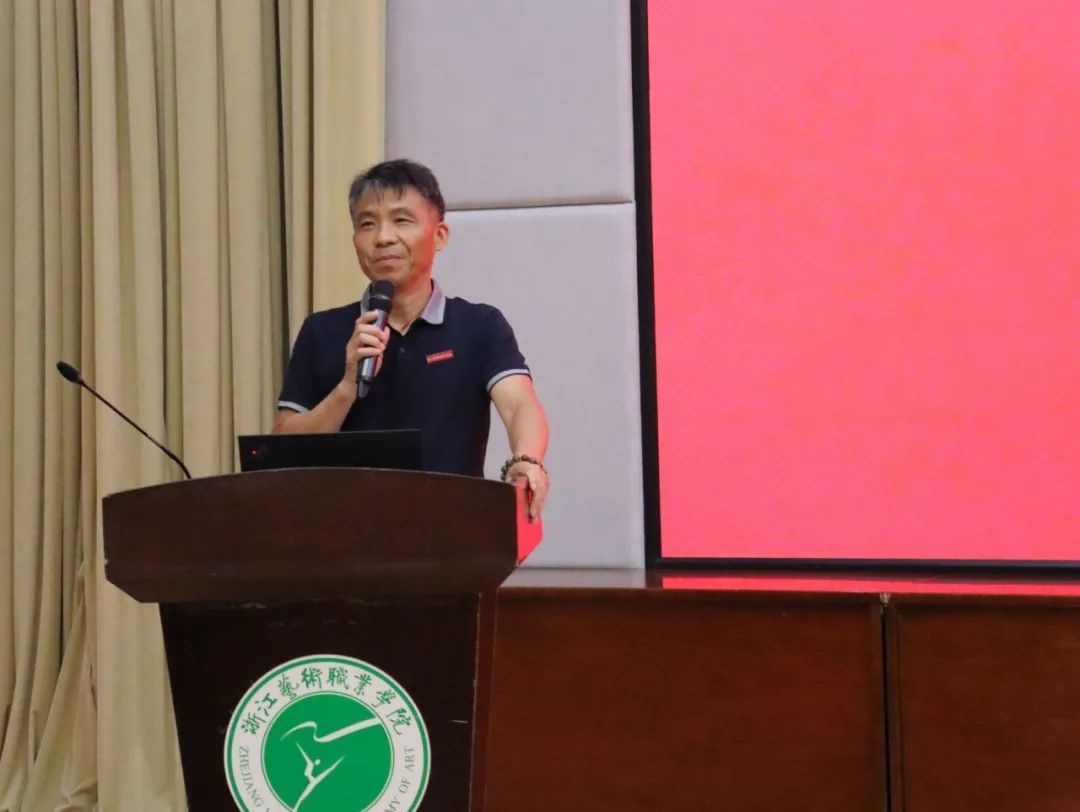 首先,沈军甫对2023级全体新生表示了热烈的欢迎,勉励新生树立匠人精神,锤炼过硬专业本领,投身于中国特色社会主义现代化国家建设。沈军甫对新生提出了四点寄语:一是向上而生,奋勇向前,在实干中掌握技艺和知识;二是向上而为,崇善向礼,在社会实践中实现人生价值;三是向美而行,勤学好问,在文化传承中创新手段;四是求真尚美,精艺修为,在艺术创作中大有所为。