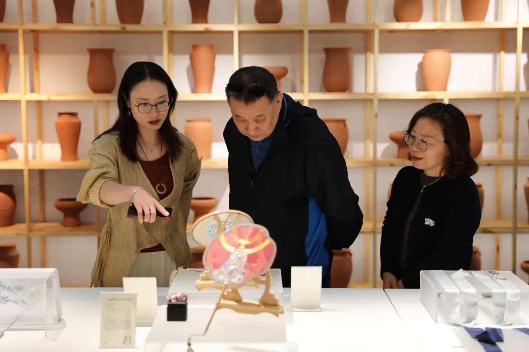 调研伊始,手工艺学院民族传统技艺研究所负责人陈沁杰、民族传统技艺专业教研室主任胡锦霞、文物修复与保护专业教研室主任潘文娟、专业教师江杰、展示艺术设计专业教师孙艺萌等引导大家参观了学院“匠心守艺”教学成果展,从书画装裱、古籍修复、古陶瓷修复、青瓷烧造、金工首饰、刺绣工艺、水印木刻、石雕篆刻、传统印染、文创产品设计等方面为调研团队阐释了手工艺学院的工艺美学思想。