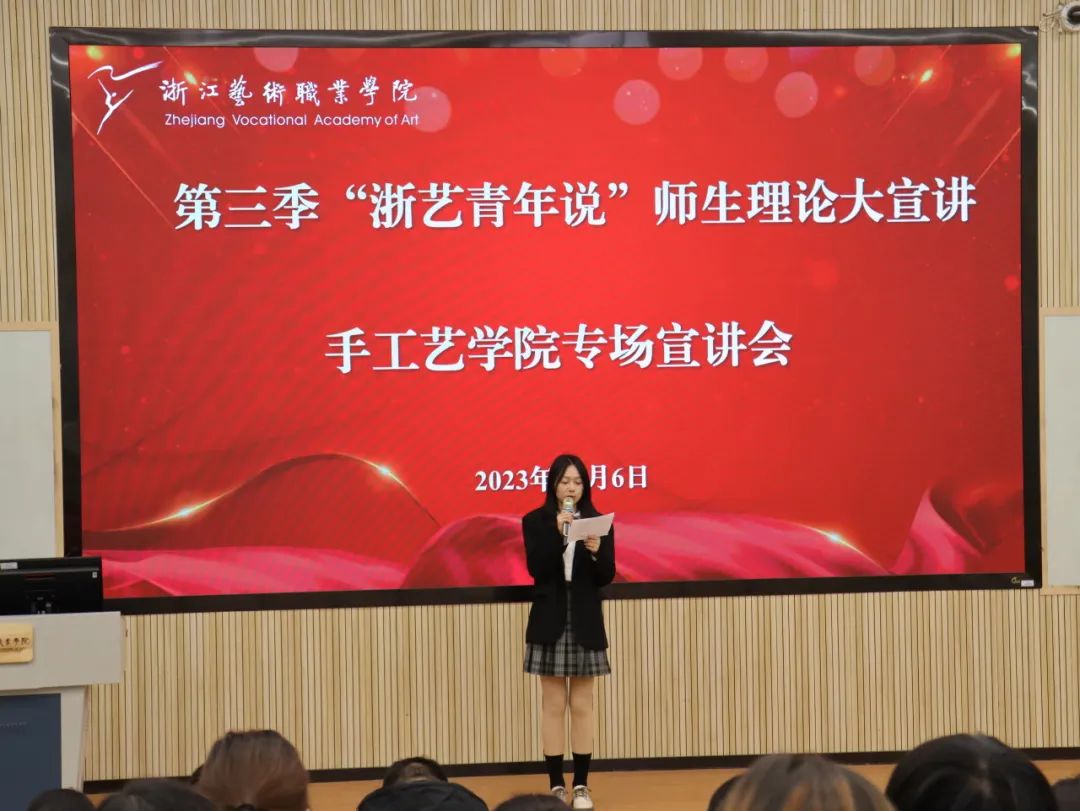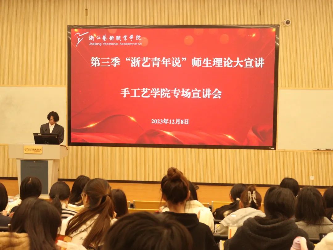 为深入学习宣传贯彻习近平总书记考察浙江重要讲话精神、习近平文化思想、习近平总书记对宣传思想文化工作重要指示精神以及全国宣传思想文化工作会议精神,12月6日和12月8日中午,由校党委宣传部、马克思主义学院、校团委联合主办的第三季“浙艺青年说”师生理论大宣讲活动手工艺专场如期开讲,手工艺学院全体教师和学生代表列席聆听。