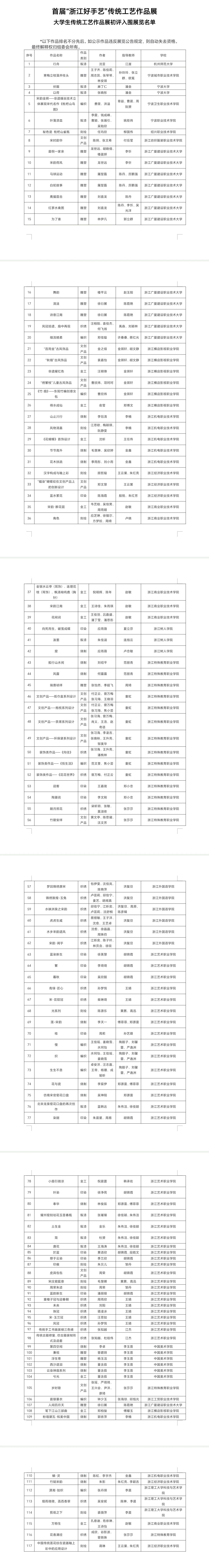 附件:首届“浙江好手艺”传统工艺作品展——大学生传统工艺作品展初评入围展览名单