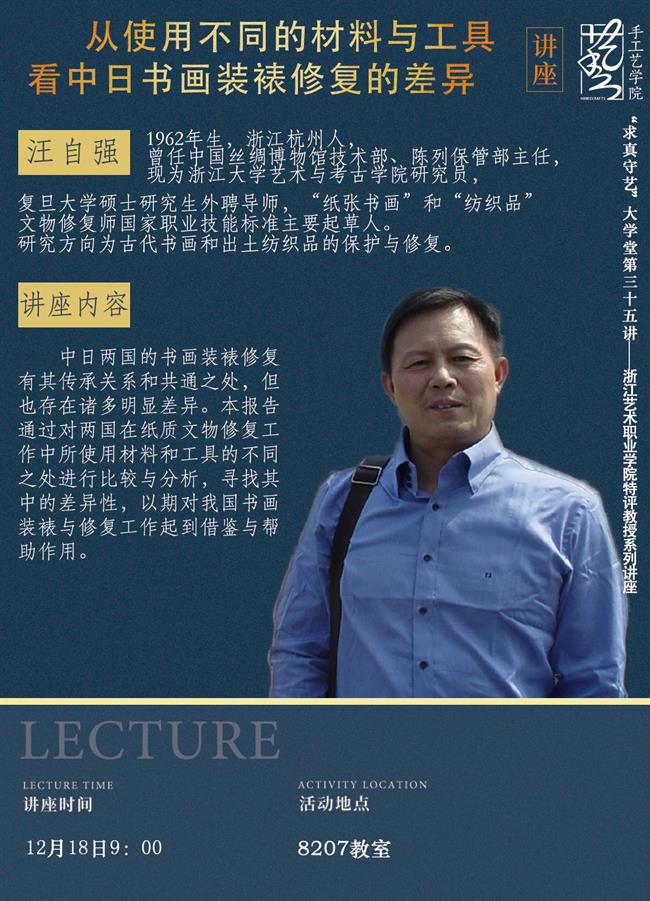 为了解中日书画装裱修复的差异,拓展关于中日书画装裱修复的工具和技艺知识,近日手工艺学院开展“求真守艺”大讲堂第35讲专题讲座活动,特邀浙江大学艺术与考古学院研究员、复旦大学硕士研究生外聘导师、“纸张书画”和“纺织品”文物修复师国家职业技能标准主要起草人——汪自强教授带来一场题为《从使用不同的材料与工具看中日书画装裱修复的差异》的专题讲座。讲座由文物修复与保护教研室主任潘文娟主持。