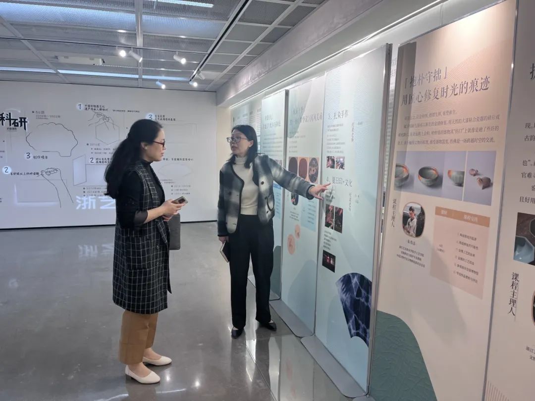 手工艺学院党总支书记钟黎介绍了学院课程体系、学生优秀作品以及人才培养方案等内容,学院领导班子陪同参观“匠心守艺”非遗创意成果展,希望与浙江旅游职业学院旅行服务与管理学院加强院际交流和合作,共同探索学院发展和人才培养新路径。