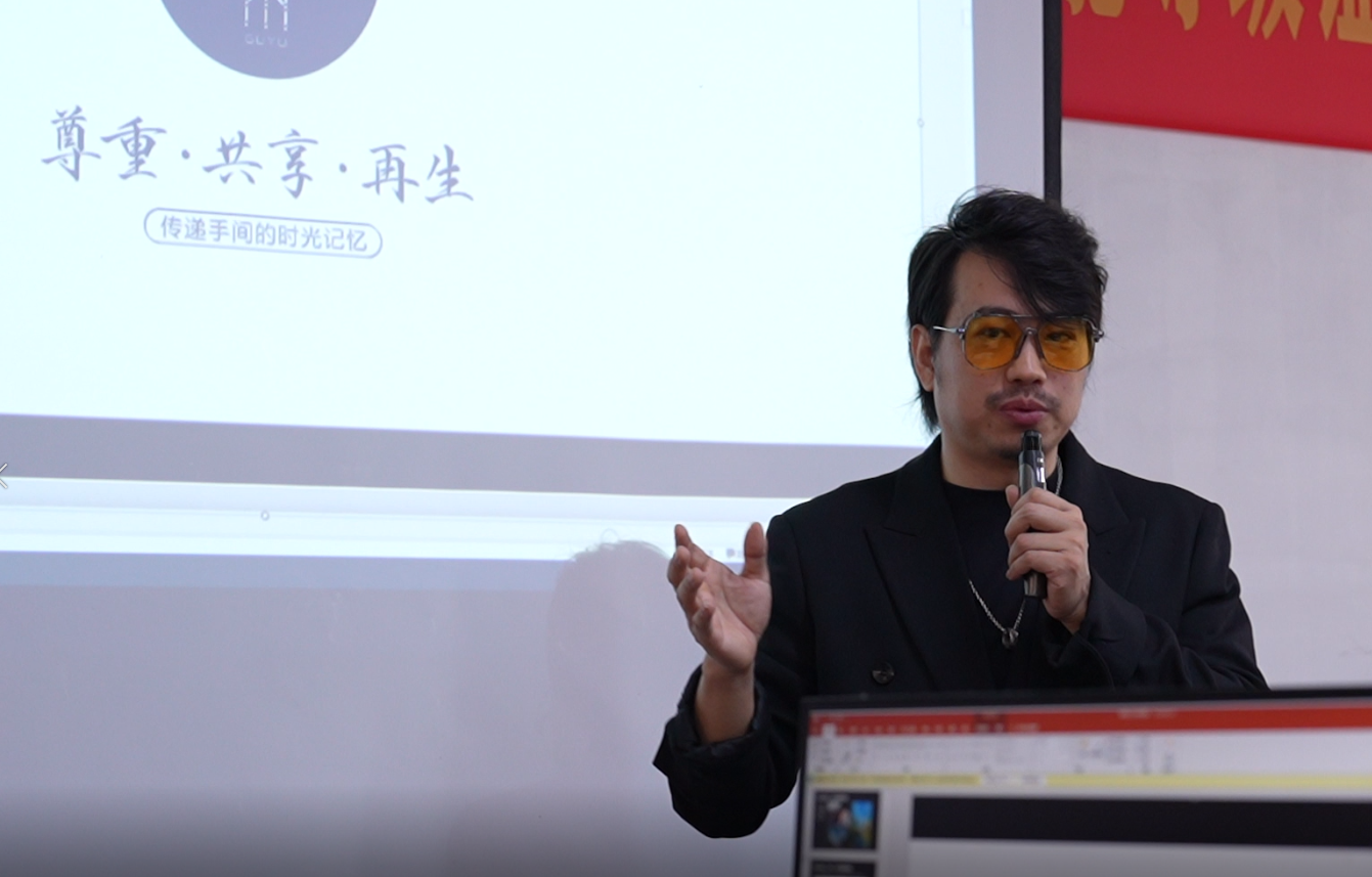 徐飞还引用了自己在2016年作为联合创始人创办“谷雨中国”的案例,“谷雨中国”致力于中国传统手艺人纪录片平台搭建,获得了1000万的天使投资。现场播放的“谷雨中国”视频集锦精彩深刻,发人深省,学生被其生动的叙事、唯美的镜头吸引,也随之思考起“尊重、共享、再生”的关系,对于传统技艺的现代表达有了更加深入的认识。