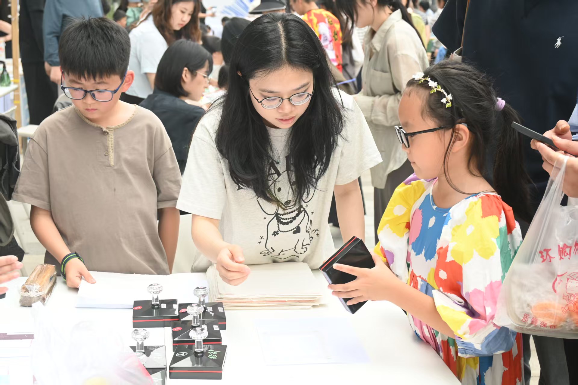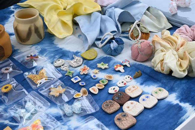 在浙艺手工艺创意市集上,扎染手作、陶瓷胸针、青瓷茶具、油印藏书票、迷你书籍,琳琅满目的作品引来人们驻足欣赏。将创意融进课程、让作品走出校门,手艺学子此行收获满满。