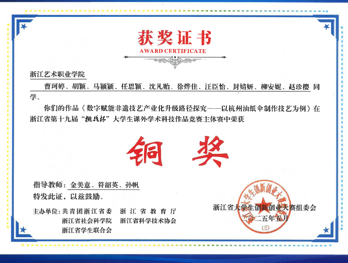 团队与非物质文化遗产早已结下的深厚缘分——在上个学期,团队成员围绕杭州油纸伞的保护与发展展开调研实践,不仅用详实的调研勾勒出这项非遗技艺的生存现状,更凭借创新性的保护思路斩获省赛铜奖。
