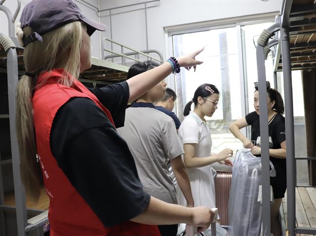 当天,“艺小匠”们主动上前接过新生手中的行李,引导校园路线,助力新生顺利抵达宿舍。新生与家长默契配合,在寝室内有条不紊地整理床铺、收纳物品,迅速将新“小家”布置得整洁温馨。志愿者们的贴心服务赢得了新生及家长的一致好评