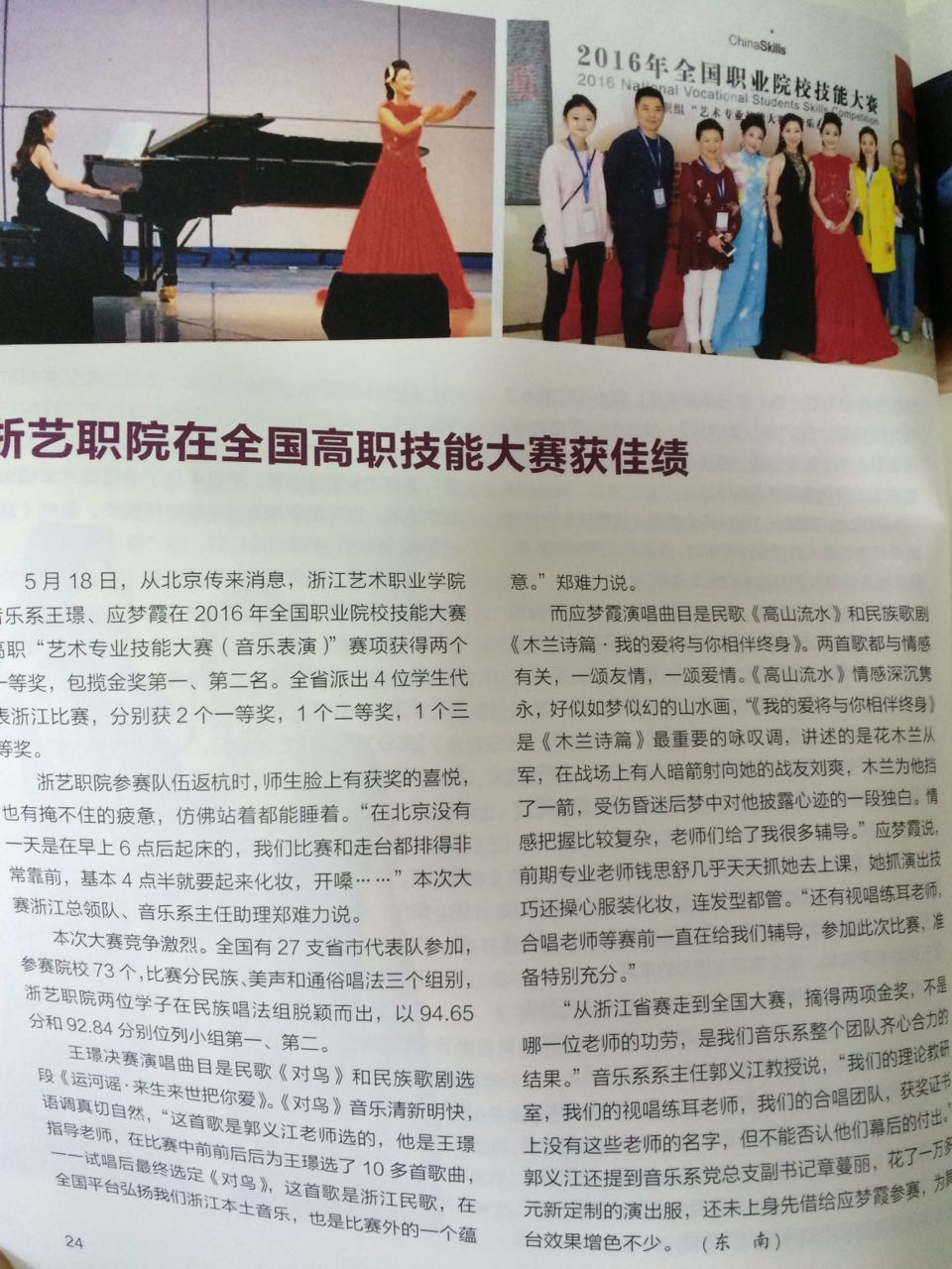 5月18日,从北京传来消息,浙江艺术职业学院音乐系王璟、应梦霞在2016年全国职业院校技能大赛高职“艺术专业技能大赛(音乐表演)”赛项获得两个一等奖,包揽金奖第一、第二名。全省派出4位学生代表浙江比赛,分别获2个一等奖,1个二等奖,1个三等奖。