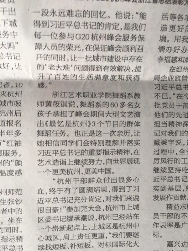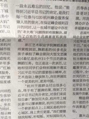 浙江艺术职业学院舞蹈系教师黄筱淇说,舞蹈系的60多名女孩子承担了峰会期间大型文艺演出《最忆是杭州》3个节目的群体舞蹈任务。也正是这一次亲历,让她相信同学们会特别理解并落实习近平总书记的重要指示精神,在艺术造诣上继续努力,向世界展现一个更美杭州、更美中国。