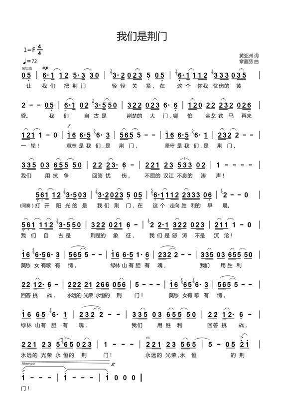 如果说《青联的力量》展现了章蔓丽作为青联委员的使命和担当,那么由著名诗人、中国作协原副主席、浙江省作家协会名誉主席黄亚洲作词,章蔓丽作曲的《我们是荆门》,则寄托了对战疫前线荆门的深厚感情和美好祝愿。
