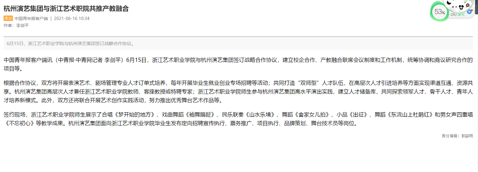 中国青年报:杭州演艺集团与浙江艺术职院共推产教融合