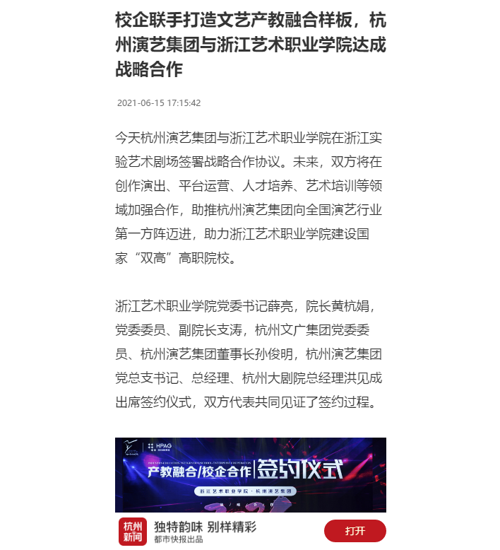 杭州新闻:校企联手打造文艺产教融合样板,杭州演艺集团与浙江艺术职业学院达成战略合作