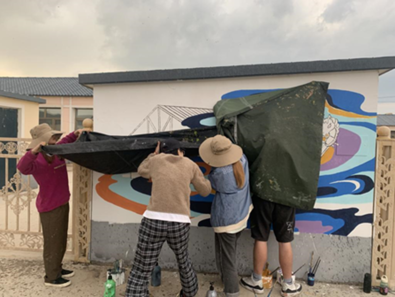 阿尔山市是文化和旅游部定点帮扶县(市)之一,文化和旅游部选派到阿尔山市明水河镇西口村驻村的第一书记郑海勇是本次墙绘与写生活动的主要发起者和组织者。“浙江艺术职业学院师生完成墙绘创作。孩子们用身体遮挡风雨,避免颜料未干被大雨稀释的场景让人动容”,郑海勇在微信朋友圈发布的相关内容发自肺腑、打动人心,是浙艺师生们,也是所有墙绘团队,在西口村辛勤付出的真实写照。