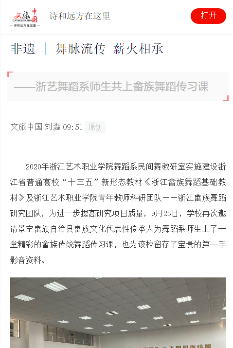 2020年浙江艺术职业学院舞蹈系民间舞教研室实施建设浙江省普通高校“十三五”新形态教材《浙江畲族舞蹈基础教材》及浙江艺术职业学院青年教师科研团队——浙江畲族舞蹈研究团队,为进一步提高研究项目质量,9月25日,学校再次邀请景宁畲族自治县畲族文化代表性传承人为舞蹈系师生上了一堂精彩的畲族传统舞蹈传习课,也为该校留存了宝贵的第一手影音资料。