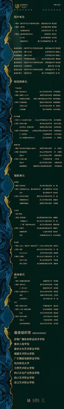 本届电影节在短片、短视频、摄影、剧本四大竞赛单元中角逐出62个单项奖以及10个最佳组织奖。