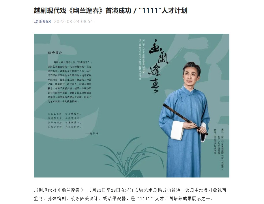 越剧现代戏《幽兰逢春》首演成功 / “1111”人才计划