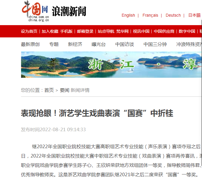 继2022年全国职业院校技能大赛高职组艺术专业技能(声乐表演)赛项夺冠之后,8月19日,2022年全国职业院校技能大赛中职组艺术专业技能(戏曲表演)赛项再传喜讯,浙江艺术职业学院戏曲学院参赛学生陈子心、王欣妍荣获地方戏组团体一等奖,指导教师周伟君、苏苏获优秀指导教师奖。这是浙艺戏曲学院参赛团队继2021年之后二度荣获“国赛”一等奖。