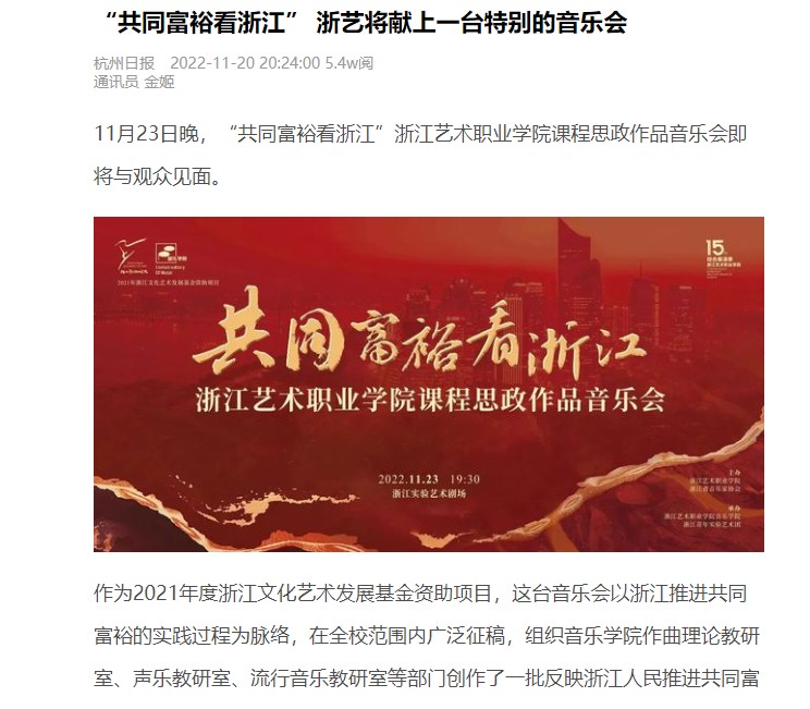 11月23日晚,“共同富裕看浙江”浙江艺术职业学院课程思政作品音乐会即将与观众见面。