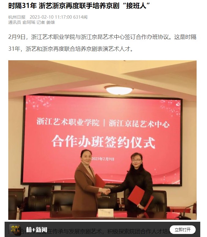 2月9日,浙江艺术职业学院与浙江京昆艺术中心签订合作办班协议。这是时隔31年,浙艺和浙京再度联合培养京剧表演艺术人才。