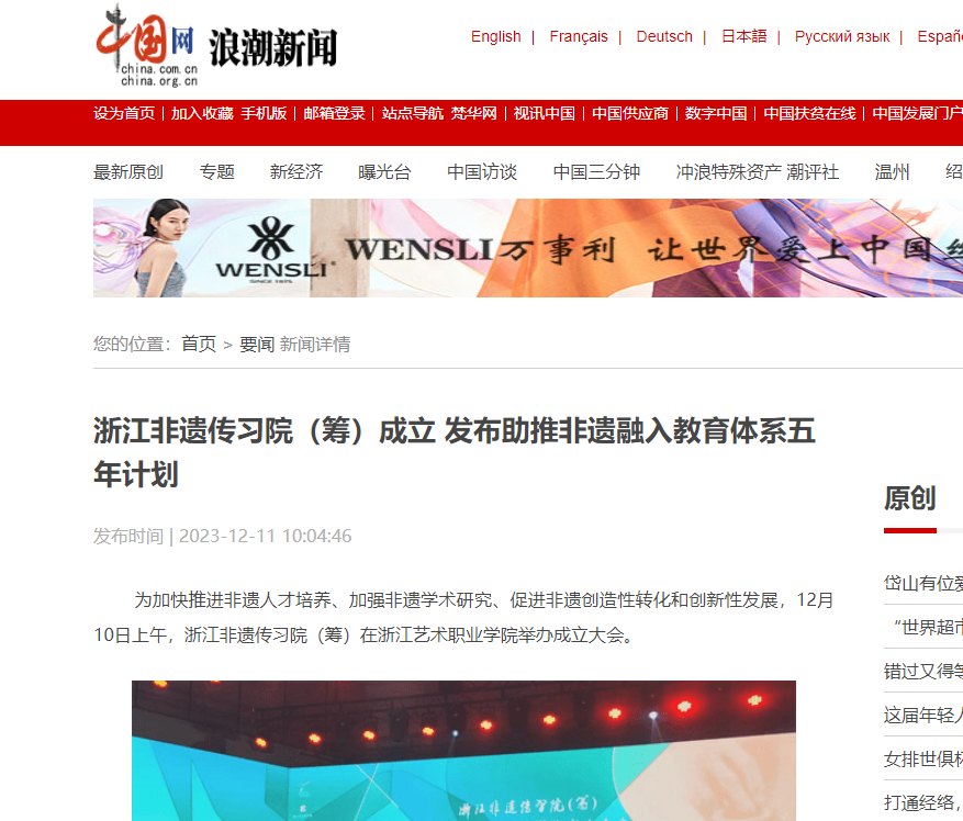 中国网浪潮新闻:浙江非遗传习院(筹)成立 发布助推非遗融入教育体系五年计划