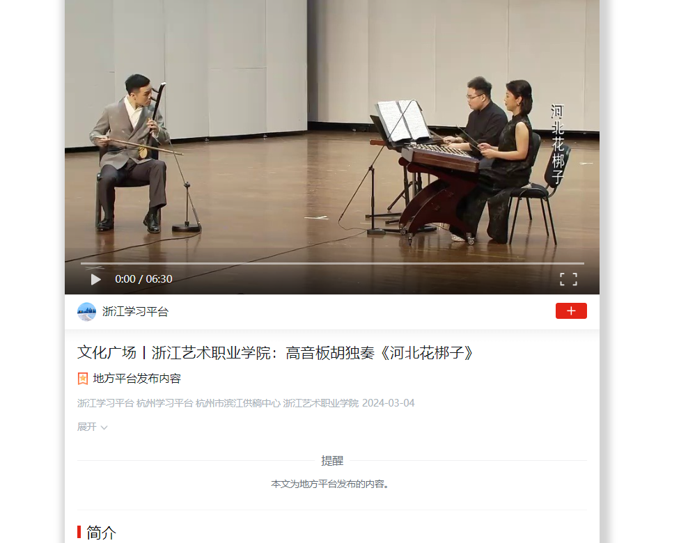 学习强国浙江平台:文化广场丨浙江艺术职业学院:高音板胡独奏《河北花梆子》