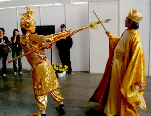 当表演《黄金甲》的COSER们被人群簇拥着离开舞台,狂热的Fans立即围堵了“翼漫堂”展位前的空间,演员们顾不上演出的疲劳,与大家合影留念。“皇上”的扮演者章扬同学淋漓尽致地表现了一位王者的威严,而金盔金甲、手持金剑的“杰皇子”扮演者更是引起了大家的注意,由于化妆后的他与电影中的“杰皇子”非常相似,观众争先恐后与他合影,小小的展位前被观众围得水泄不通。