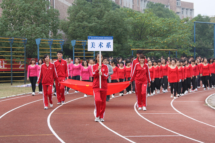 同学们青春活力的身影,老师们带队高昂的热情,本届运动会的入场队伍打出了头阵,最先吸引师生们的眼球。戏剧系、音乐系、美术系、附中、舞蹈系、影视技术系、文化管理系依次接受主席台的检阅。在激昂的音乐声中,运动会的氛围在浙艺院的操场上洋溢开来,以一种轻松大气,活跃开怀的气势在秋日的暖阳中绽放起艺院独特的芳华。
