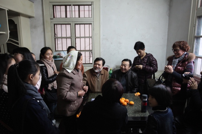 师生一行到达嘉善县丁栅镇沉香村,村里住着一位原生态歌手顾秀珍,她是当年唱田歌红遍大江南北的“顾家两姐妹”中的老二,而今的顾奶奶也已经74岁了。一进老奶奶家,印入眼帘的就是大墙上挂着两张奖状——“双十佳文明示范家庭”和“一九九五年首届‘万川杯’吴歌大奖赛二等奖”。老奶奶热情地捧出自家种的橘子,邀请同学和老师们品尝,在昏暗而拥挤的农村平房中,却洋溢着一片热闹喜庆。围坐下来,老奶奶开始和大家讲述自己年轻时参加比赛的场景,并为大家演唱了原生态嘉善田歌,“跌落声”“大头歌”“急急歌”等曲调被老人再度演绎,很难想象,那时年轻美丽,红遍大江南北的“顾家两姐妹”是如此朴素,也许正是这种朴实无华,这些原生态且富有民风民俗的艺术品、艺术形式,才得以真正保留,成为宝贵的文化财富。