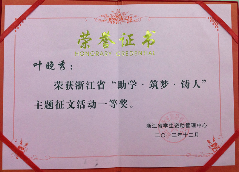 由全国学生资助管理中心主办,各省、各中央部属高校学生资助管理中心协办的2013年度“助学·筑梦·铸人”主题征文系列传播活动的评选工作中,我院音乐系2011级叶晓秀同学的征文作品《阳光“小茶苗”》以浙江省“助学·筑梦·铸人”主题征文比赛第一名的成绩被选送参赛,在7万多篇征文中脱颖而出,最终获得该评选活动优秀奖。浙江省共计6篇征文获奖。