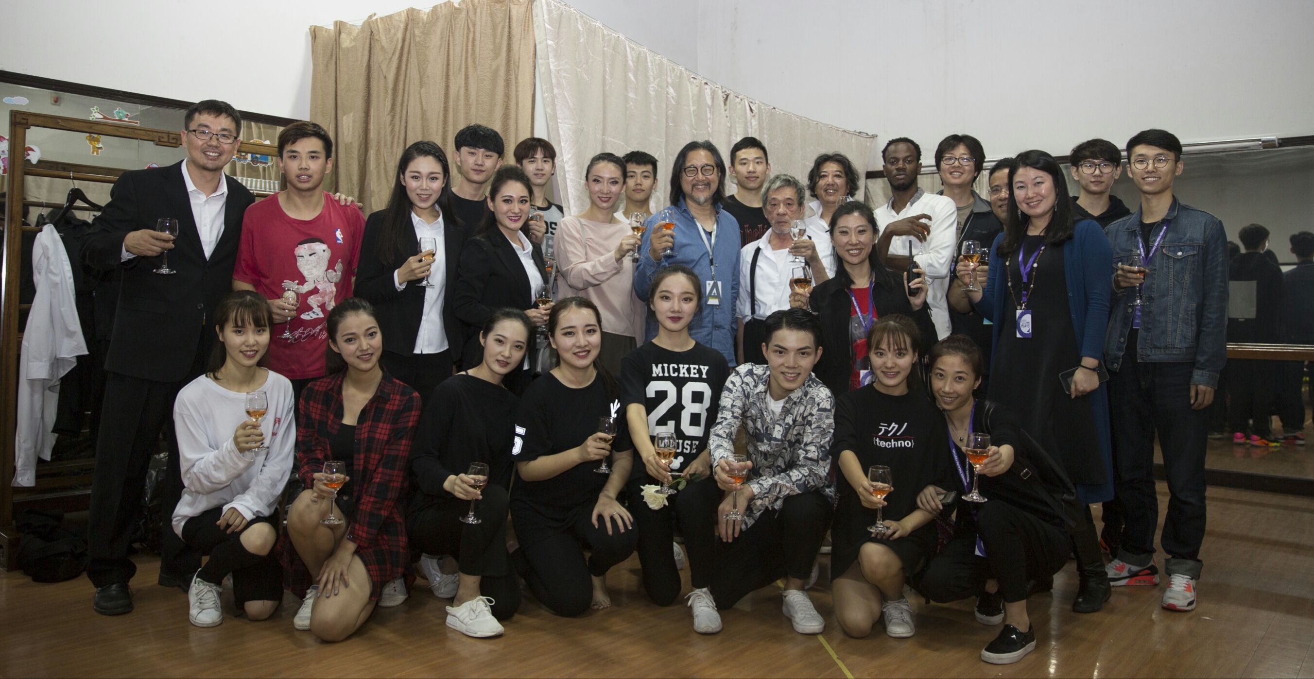 日月广场舞台演出地点在日月广场,由于第二天就是首演,于是在到达乌镇的当天下午,师生们便投入了紧张的排练。为了将自己最好的一面呈现给观众,大家保持了高昂的热情,使得联排一遍比一遍出色。演出前,所有演员就位,一起握手,共同加油。从走上台的那一刻起,同学们尽情享受着舞台,并以出色表现获得了剧目组的好评和观众的热烈掌声,同学们觉得,此前所有的辛苦和努力都是值得的。首演成功,令同学们倍感激动和喜悦。回到休息室后,首演庆功宴早已布置好。更让同学们振奋的是,赖声川导演也特地赶来,跟剧组成员一起合影、举杯,同贺首演成功。赖声川导演对首演成功表示祝贺,《李尔王》的导演窦辉向赖导介绍了剧组所有成员,对浙江艺术职业学院表演艺术专业加盟这次演出表示感谢,对同学们在排练中的敬业态度和在舞台上的出色表现表示赞赏。