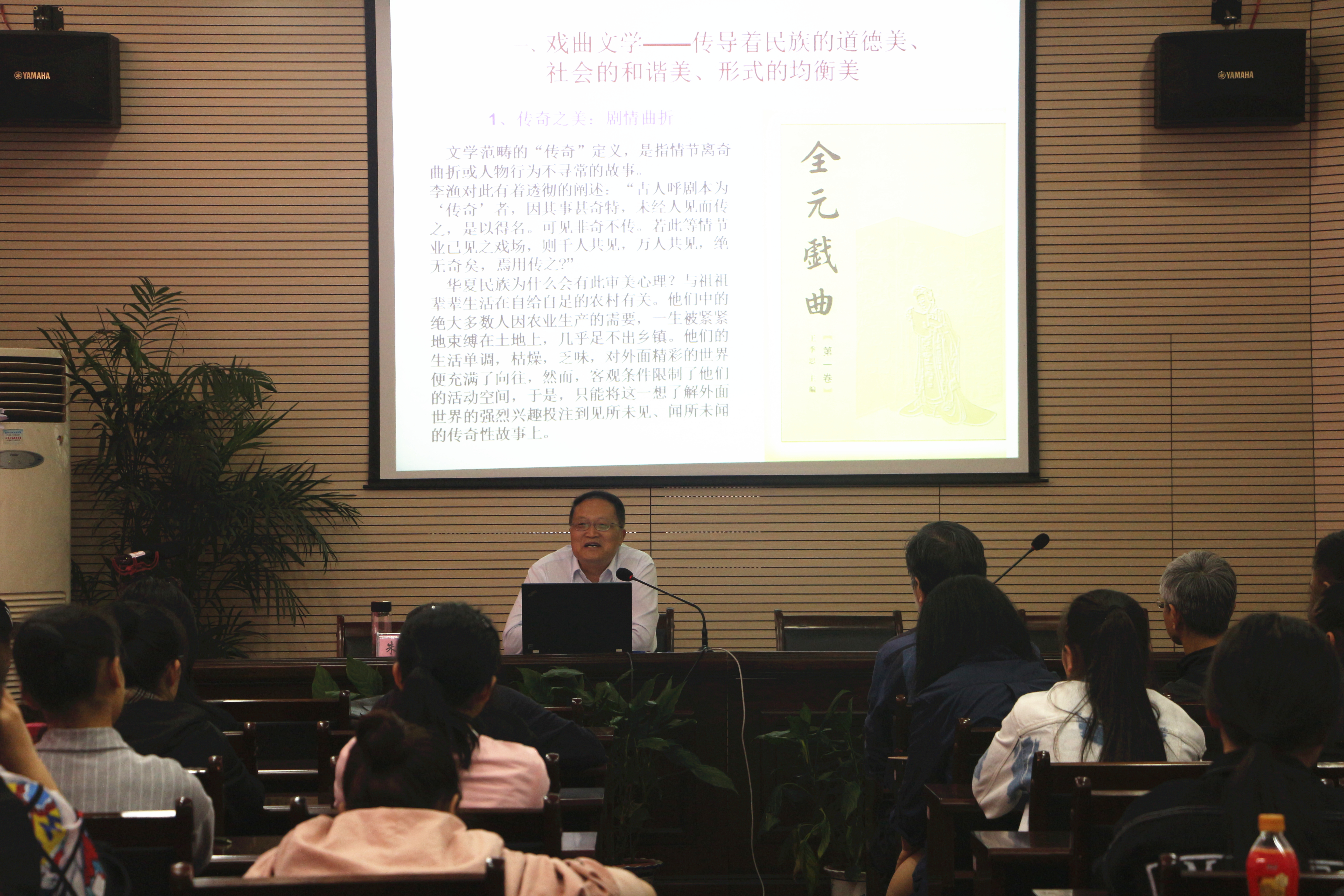 朱恒夫身兼多职,担任教育部高等学校中文学科教学指导委员会委员、中国傩戏学会副会长、中国戏曲学会常务理事、中国古代戏曲学会常务理事等社会职务,研究领域涉及戏剧戏曲学(含目连戏、傩戏、滩簧、昆曲等)、中国古代文学、中国文化史等,是业界知名专家。他围绕戏曲文学和戏曲表演两方面细致讲解了何为“中国戏曲之美”。戏曲文学方面主要有“八美”:剧情曲折的“传奇之美”,家国同一的“崇高之美”,锄暴安良的“侠义之美”,孝亲慈爱的“仁善之美”,夫妻团圆的“家庭理想”,生旦双线结构的“均衡之美”,大团圆结局的“和谐之美”,诗性语言的“意蕴之美”。戏曲表演展示了民族性格的中和之美与民族艺术的精粹之美:演员是按照“美”的标准来遴选的,歌唱说白与动作须恪守规范,以技表艺的“净丑”产生夺人心魄的魅力,继承又创新的独特表演风格,表演美学的最高境界是正确细致地表现人物心理活动。此外,朱恒夫结合《谈现代戏表演艺术水平提高的方法》这一文章,与大家探讨了现代戏存在的问题并提出了应对之策。