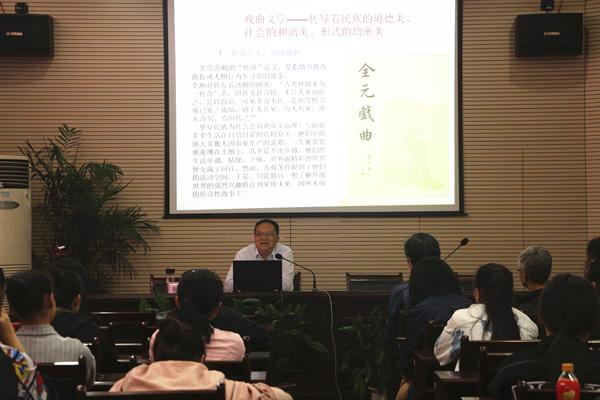 提问互动环节,科研处教授施王伟、周立波向朱恒夫提出了专业性很强的问题,他均予以细致独到的回答。由此,他还提到了有关中国戏曲文化传承与保护的问题。他说,在社会多元化发展的进程中,人们一昧崇洋媚外,传统戏曲的受关注度越来越低,如何保护传统戏曲文化及其发展已成为今后的一大题。借此,朱恒夫呼吁大家关注并传承保护中国戏曲文化。