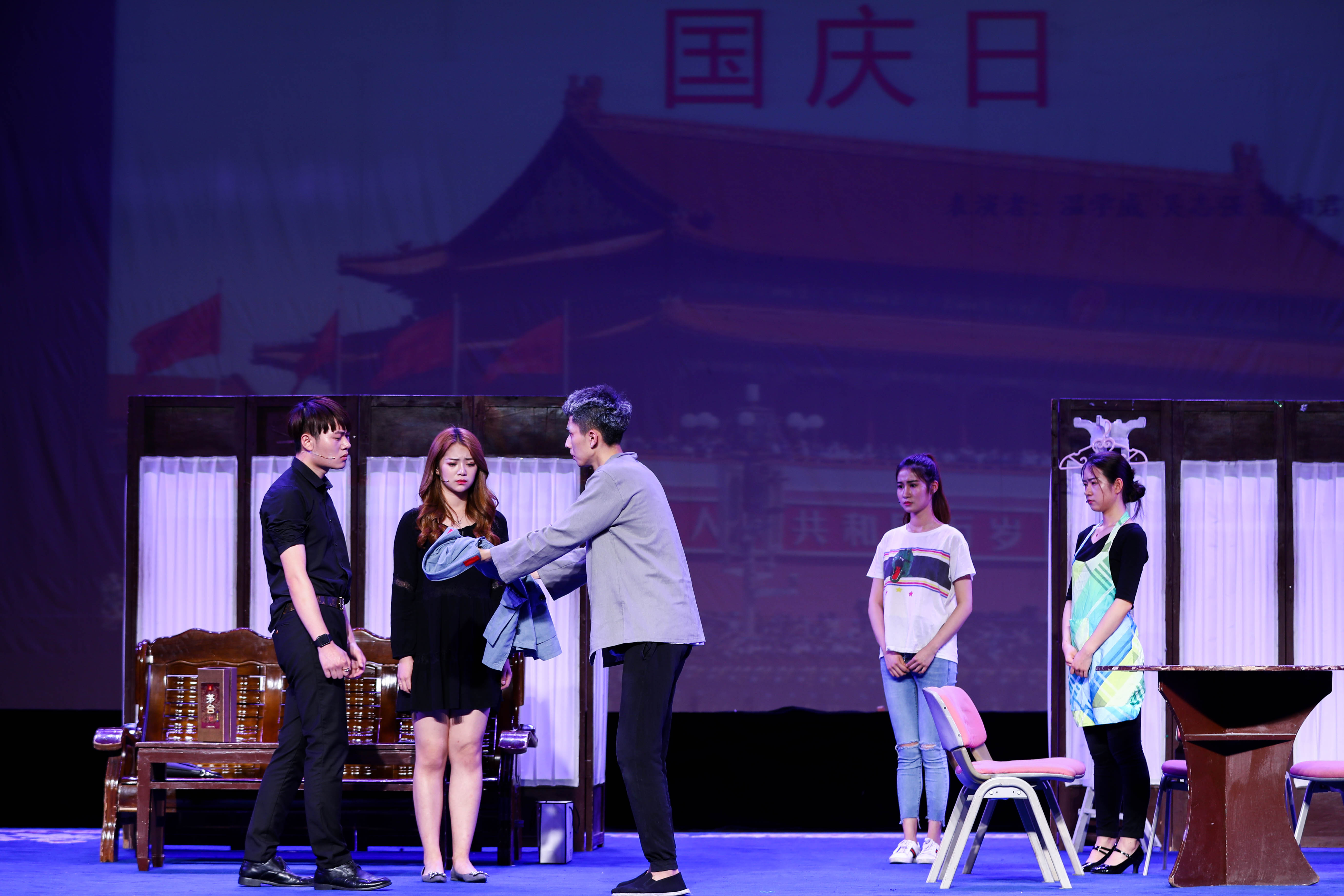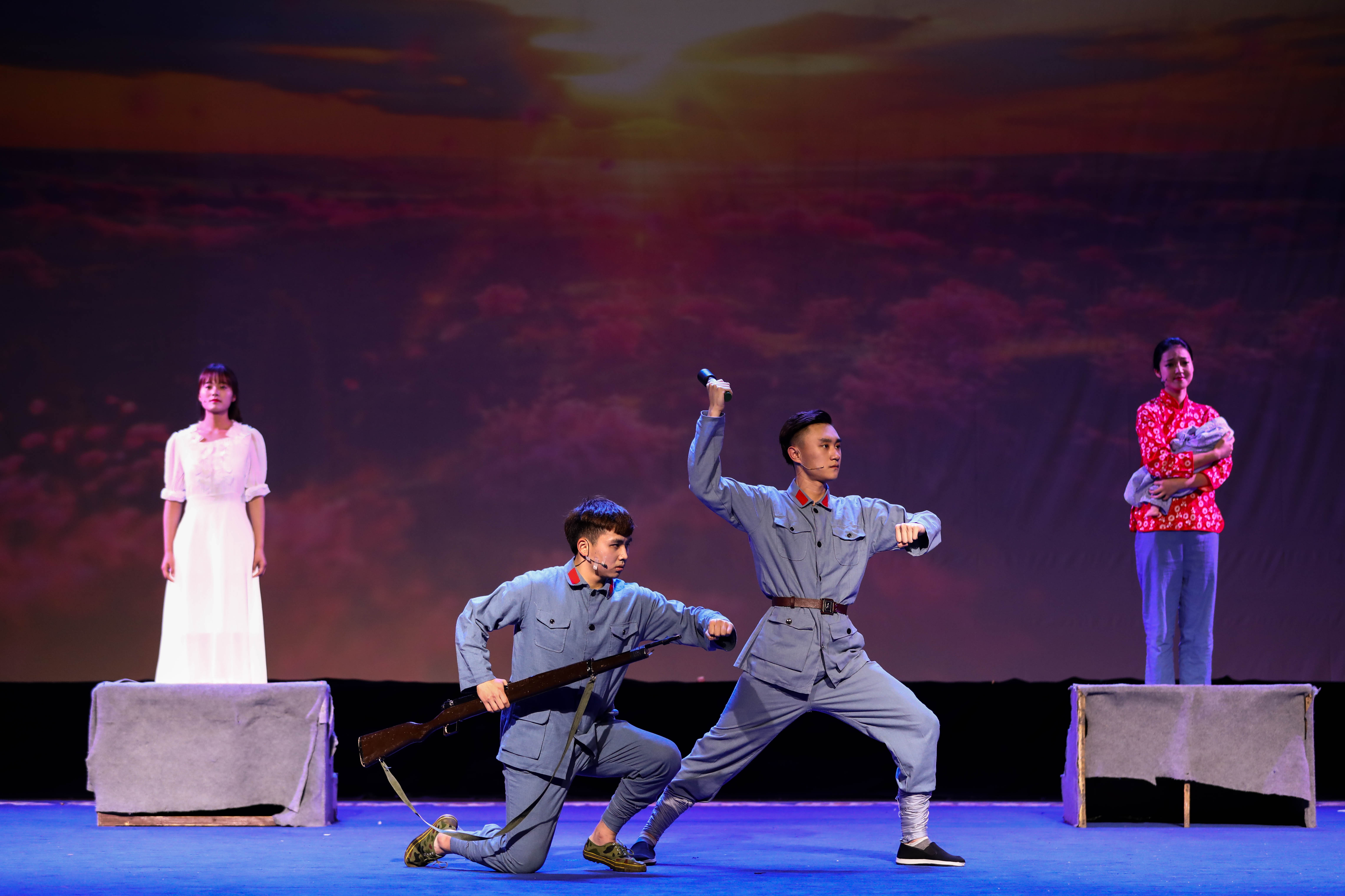 孙学增导演原创作品工作坊——江南红村采风•原创作品汇报《红色•青春》主题晚会,5月17日晚由浙江艺术职业学院戏剧系表演艺术专业学生在浙艺小剧场倾情上演。小品《双别》《七斤半面粉》《挑夫》《映山红》、情景表演《卫生队》《徐昌胜》等7个节目精彩呈现,把观众带到战火纷飞的抗战岁月,不忘初心,感人肺腑。此次演出是表演艺术专业师生们赴长兴革命老区采风后创作出的艺术成果。长兴县委宣传部副部长刘月琴、浙艺院长黄杭娟、院党委宣传教育处处长马向东、戏剧系党总支副书记李旭芳等观看演出。