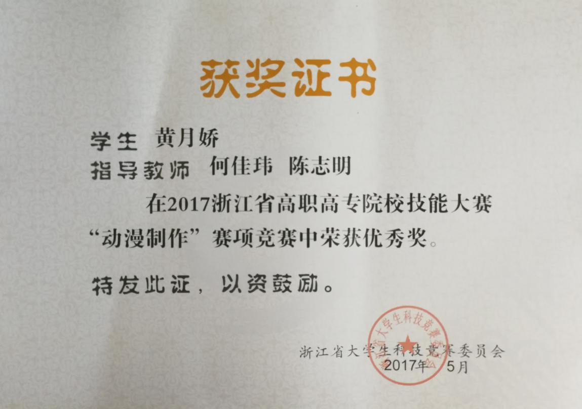 近日,由浙江省教育厅主办的2017年浙江省高职高专院校技能大赛“动漫制作”赛项竞赛在浙江纺织服装职业技术学院落下帷幕。浙江艺术职业学院美术系动漫设计专业学生刘家鑫、郑晨怡同学分获三等奖,黄月娇同学获优秀奖。