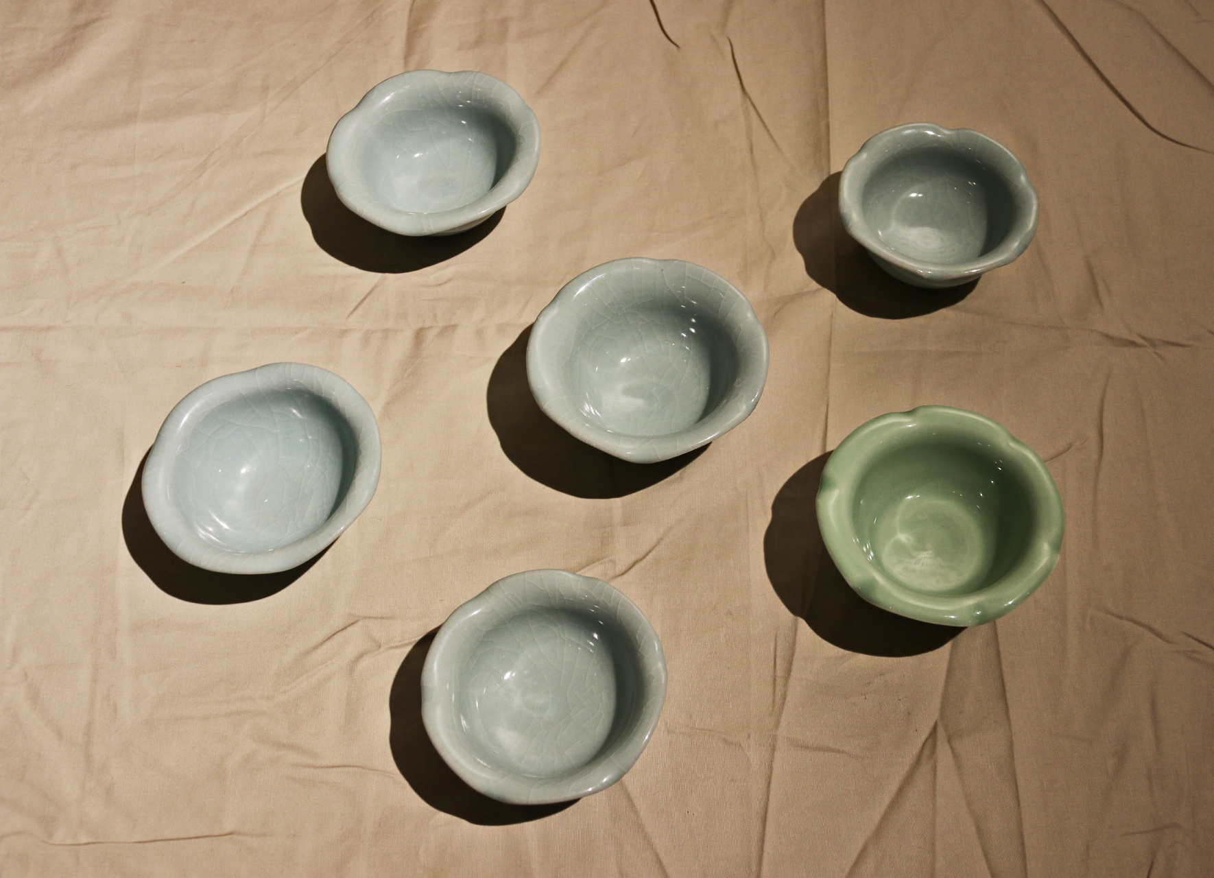 装裱作品分为字画修复与新画装裱。指导老师江杰老师说:“修复过程比较复杂,任何一步都不能错。”修复(画)共有五张作品,其中修复的画心都是从古玩市场淘过来的。字画修复总体可分为四个步骤:洗、揭、补、全,洗为清洗,揭为揭覆背纸和命纸,补为修补残破的地方 ,全为全色(补色)。这一组的展览作品制作了近一个学期,每一张修复画都要花一个月左右的时间来做。装裱部分皆按传统手工书画装裱,裱件干净清爽,笔挺柔软,清新雅致。陶艺由泥土拉坯成型,晾至七分干,接着修坯,上釉,最后烧造而成。短短一句话概括了过程,但实际却并不简单,前后花时几周甚至更长。在傅菲菲老师与郑源雷老师的指导下,陶艺组做了许多精美的作品,有各种各样的杯子,以脚胎、青瓷为主;还有小巧的泥片,样子方方正正的,似个薄薄的方盘,以刻划花为主要纹饰,再施上晶莹的釉水,烧造出来的样子十分精致。作品中还有各式贯耳瓶,器形都是形态不一的。这些作品中比较有代表性的是俞骏昊同学的“鹰首壶”,仿东晋越窑的器型,鹰首、鹰爪、鹰尾都做的相当逼真,精湛的技艺获得了围观者的好评。