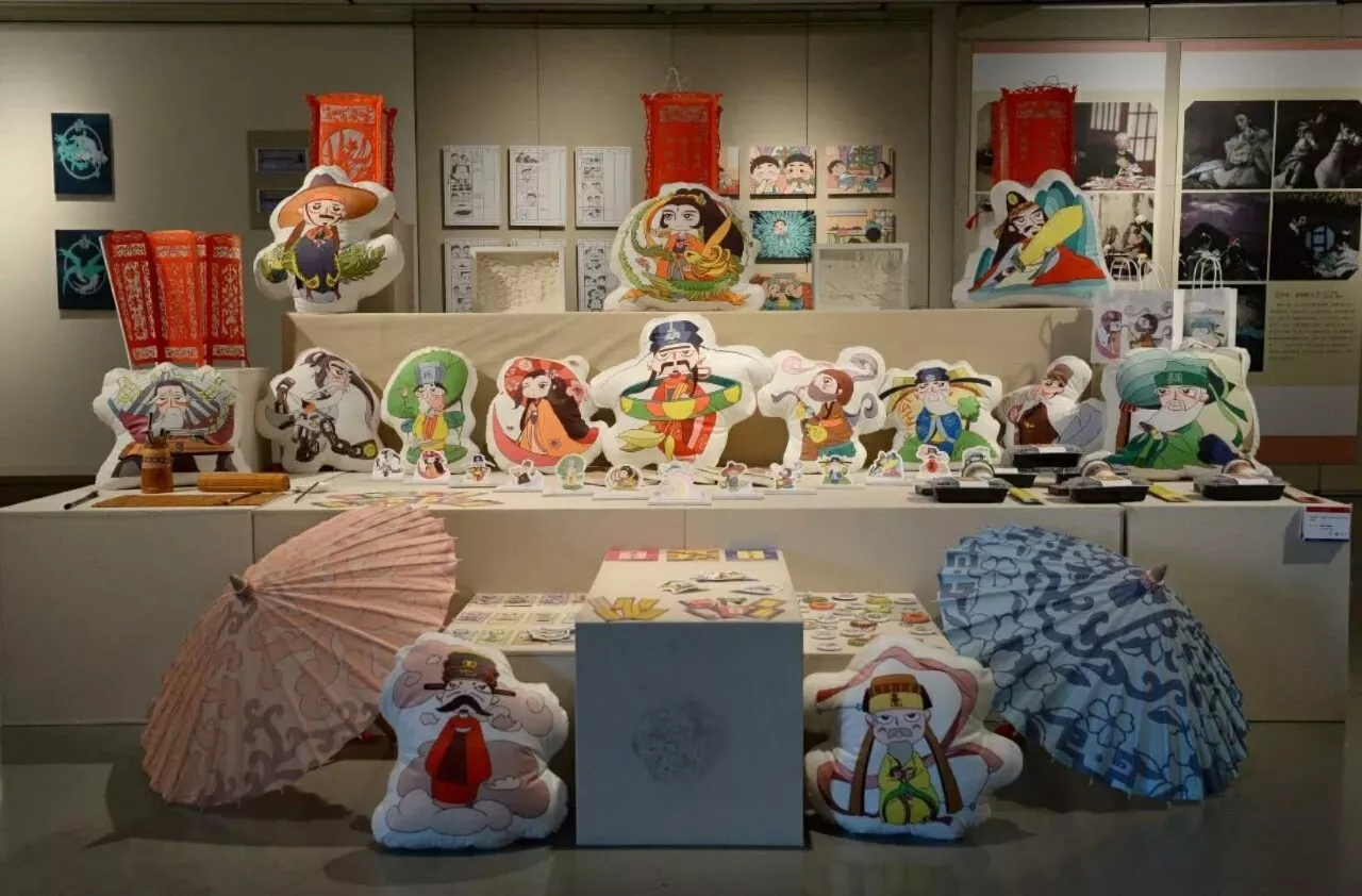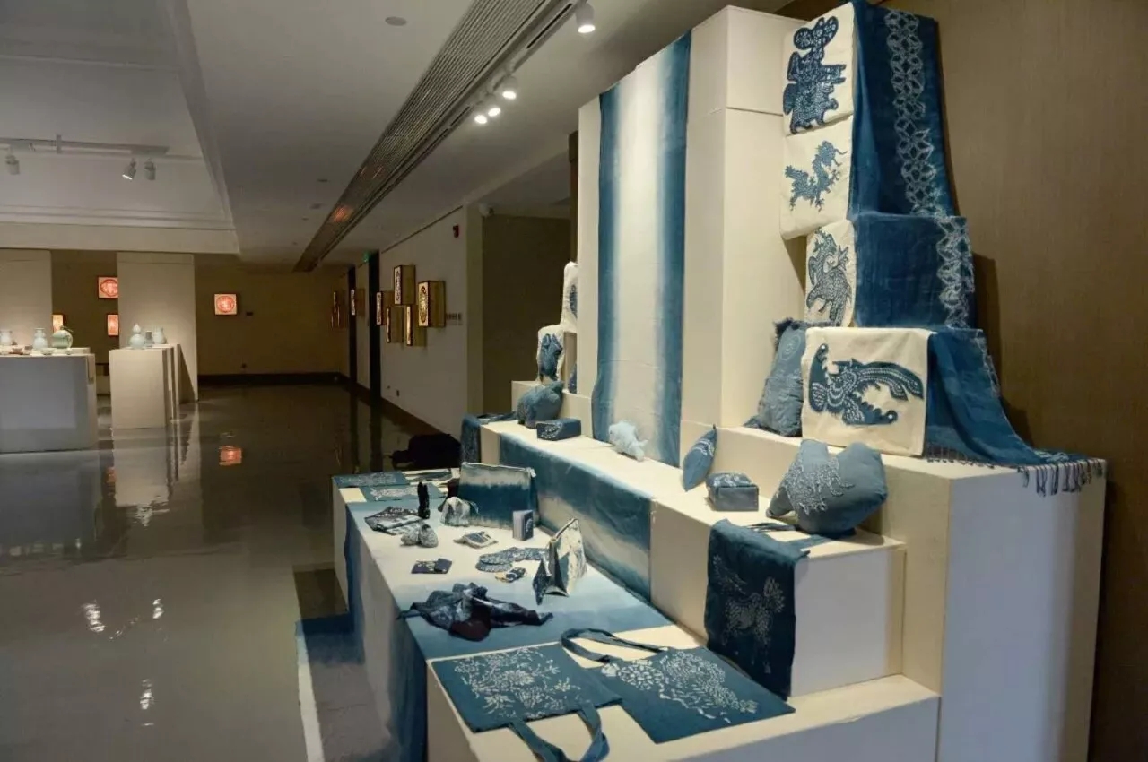 公共文化展区展览了一些蓝染印染、手工扇等作品,这些都是由板蓝根的汁液染成的,健康无害。鞋子、便签封面、手拿包、收纳盒、抱枕、帆布包等,这些蓝染制品都是纯手工制作,耐看耐洗,时间久了更有收藏价值。这些作品从调配颜料到扎染到浸泡全程都由学生亲手制作。“手工扇”以贴画的方式在扇面上贴出画面,达到层次分明的效果,细看内容非常丰富。还有浦江戏曲剪纸,以木刻版画为技艺,做成了一组灯箱,在温暖的灯光下,工艺品们活灵活现。